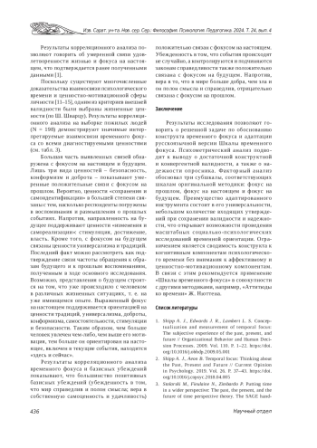 7. Zimbardo P. G., Boyd J. N. Putting time in perspective: A valid, reliable individual-differences metric // Journal of Personality and Social Psychology. 1999. Vol. 77. P. 1271-1288. EDN: GXUJBZ