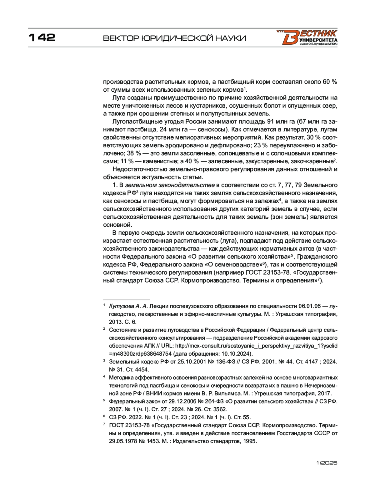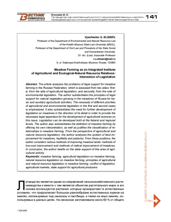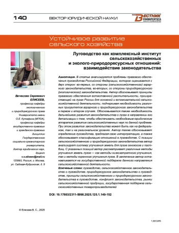 В статье анализируются проблемы правового обеспечения луговодства Российской Федерации, которое оценивается с двух сторон: во-первых, со стороны (сельскохозяйственного) аграрного законодательства, во-вторых, со стороны природоресурсного (экологического) законодательства. Автор обосновывает принципы правового обеспечения естественной растительности, произрастающей на лугах России для основной и вспомогательной сельскохозяйственной деятельности, подчеркивая необходимость различных приоритетов аграрного и природоресурсного законодательства в первом и втором случаях. Обосновывается также необходимость дальнейшего развития законодательства о лугах в направлении его детализации с тем, чтобы обеспечивать необходимым юридическим аппаратом развитие сельскохозяйственных наук по данной проблеме. При этом развитие законодательства может быть как на федеральном, так и на региональном уровнях. Автор также обосновывает определение луговодства, предлагая свою интерпретацию, а также обосновывает классификацию отношений в луговодстве. С позиции сельскохозяйственного и природоресурсного законодательства автор анализирует систему улучшения земель для лугов сенокосов и пастбищ. С указанных позиций автор рассматривает различные методы улучшения земель лугов — как методы низкозатратного улучшения, так и методы коренного улучшения лугов. В заключение автор останавливается на государственной поддержке данного направления сельскохозяйственной деятельности.