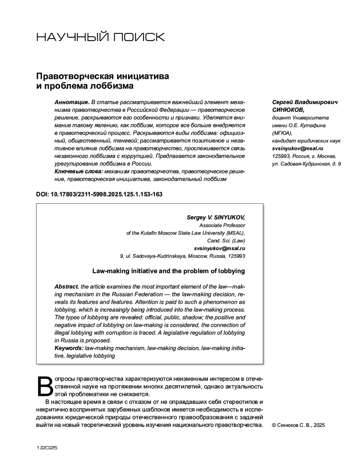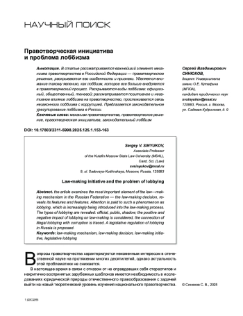 В статье рассматривается важнейший элемент механизма правотворчества в Российской Федерации — правотворческое решение, раскрываются его особенности и признаки. Уделяется внимание такому явлению, как лоббизм, которое все больше внедряется в правотворческий процесс. Раскрываются виды лоббизма: официозный, общественный, теневой; рассматривается позитивное и негативное влияние лоббизма на правотворчество, прослеживается связь незаконного лоббизма с коррупцией. Предлагается законодательное урегулирование лоббизма в России.
