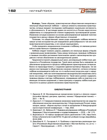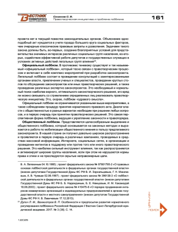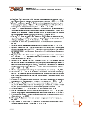 7. Дулич Л. М., Вахмистров В. П. Особенности и предпосылки развития нормативного регулирования лоббизма в Российской Федерации // Вестник СанктПетербургской юридической академии. - 2017. - № 3 (36).