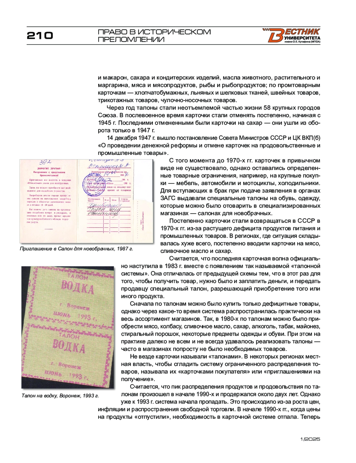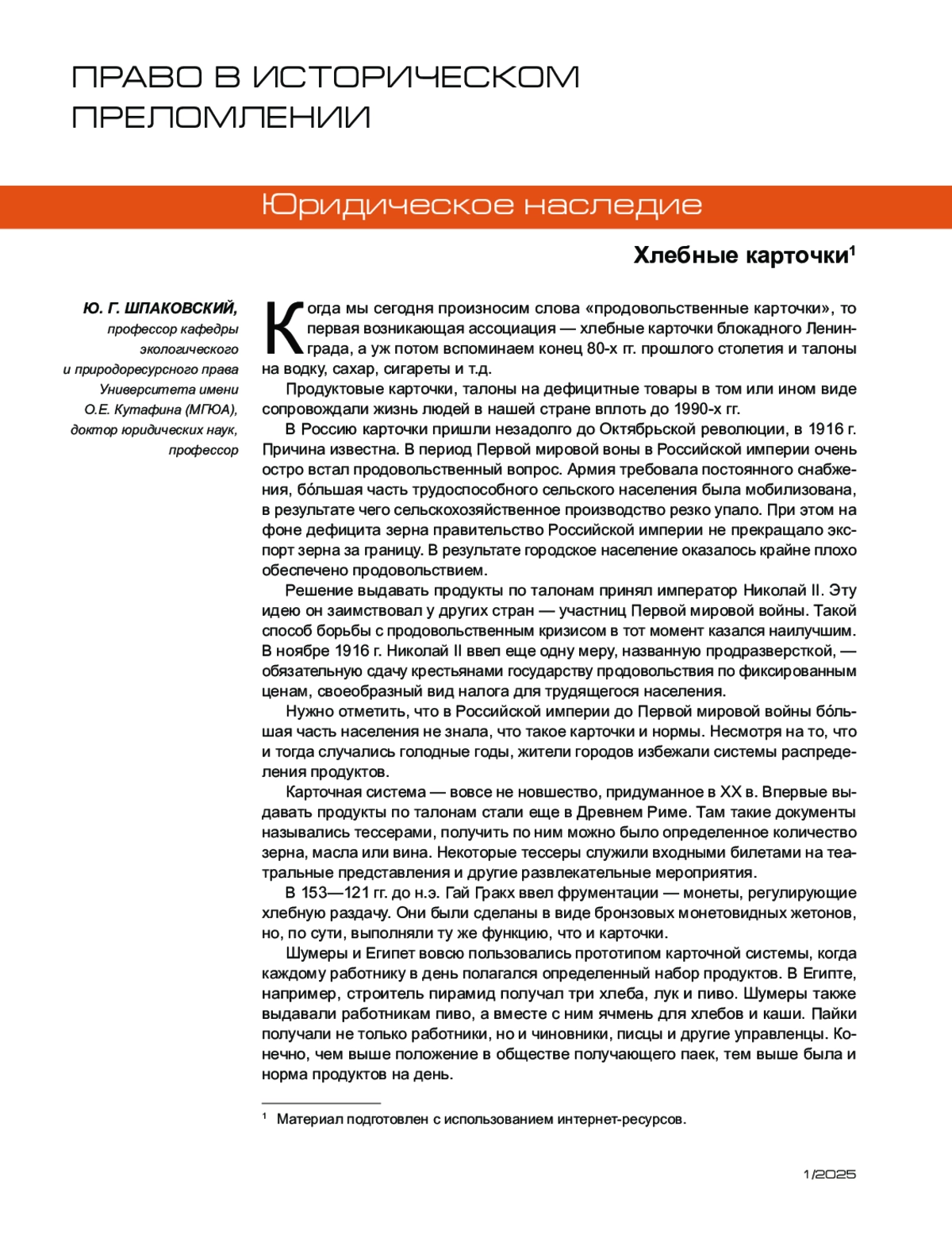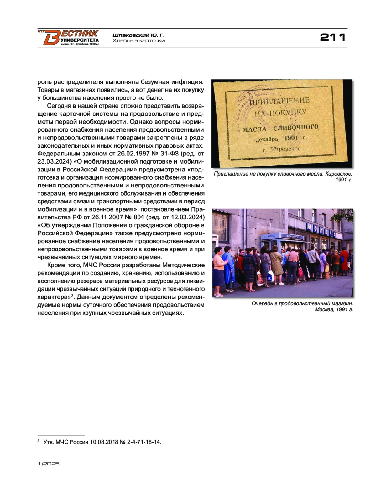 Для цитирования: Шпаковский Ю. Г. Хлебные карточки. Вестник Университета имени О. Е. Кутафина (МГЮА). 2025;1(1):206-211.