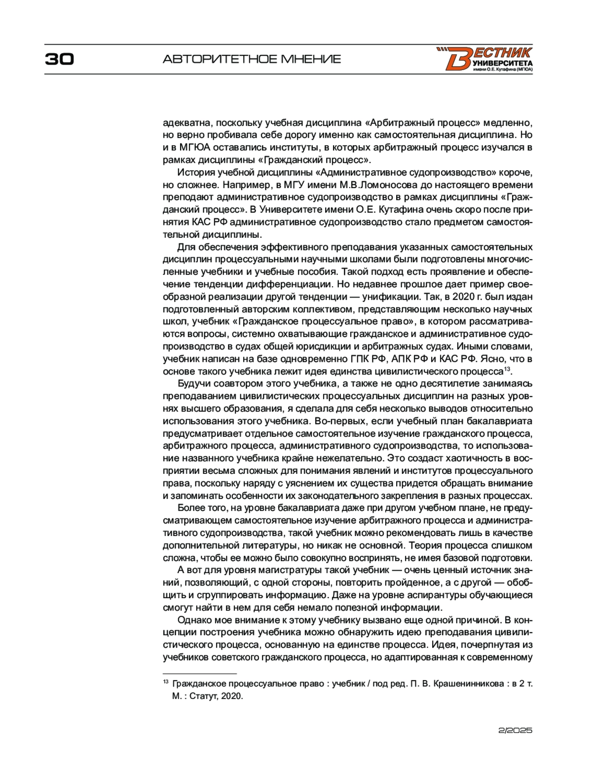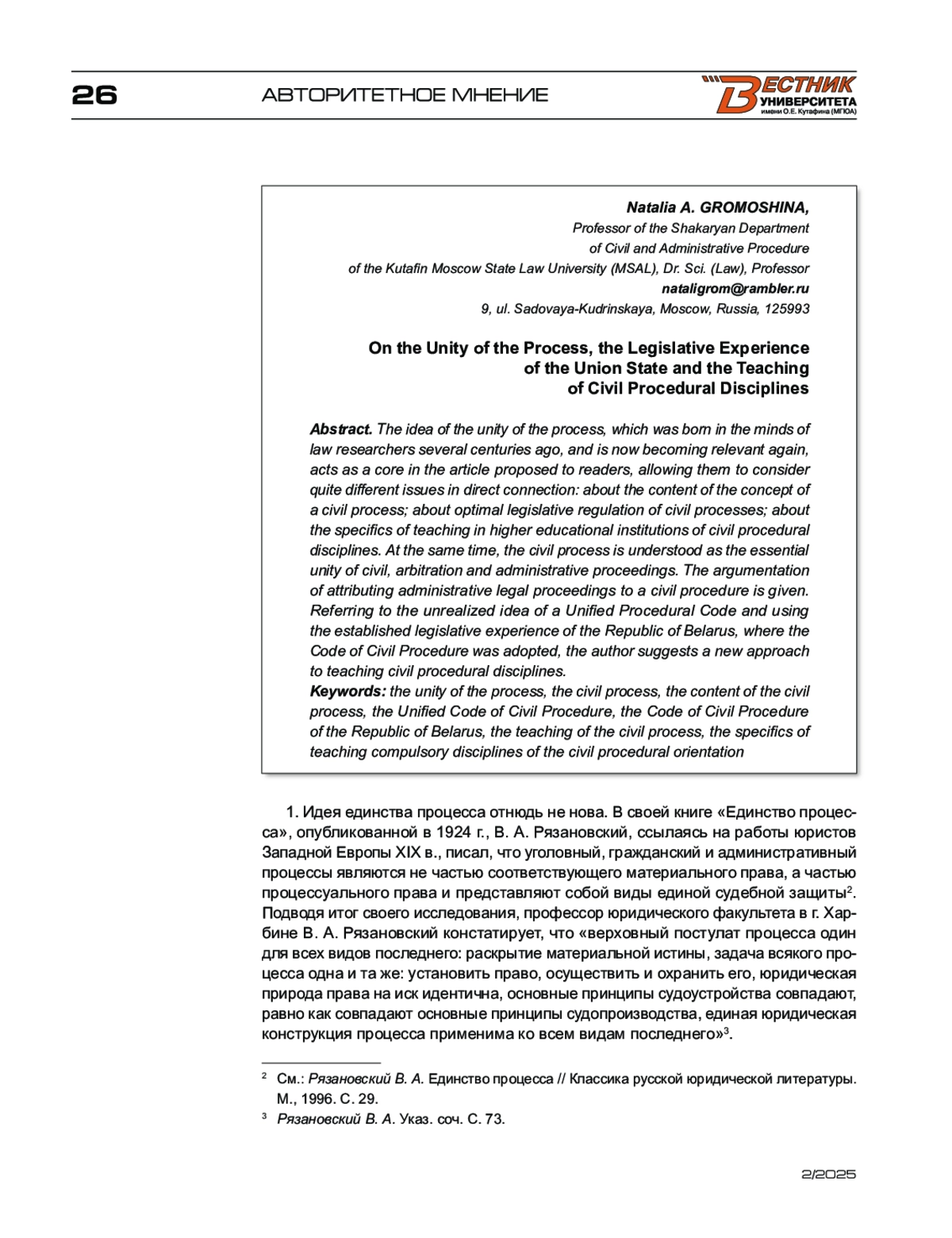 5. Об итогах Всероссийского методологического совещания заведующих кафедрами процессуальной направленности «Модель подготовки судебного юриста» // Хозяйство и право. - 2025. - № 1 (576). - С. 111-122.