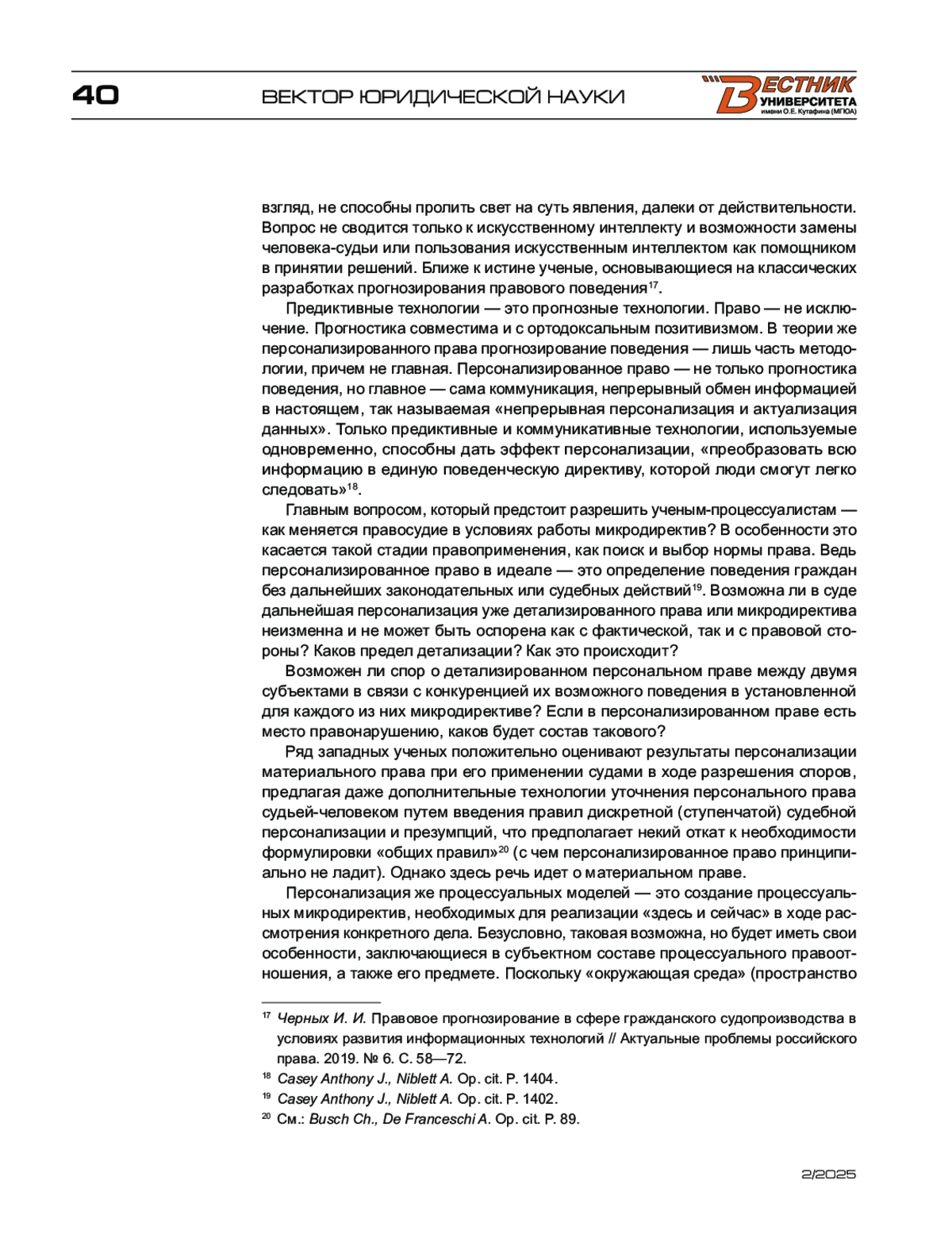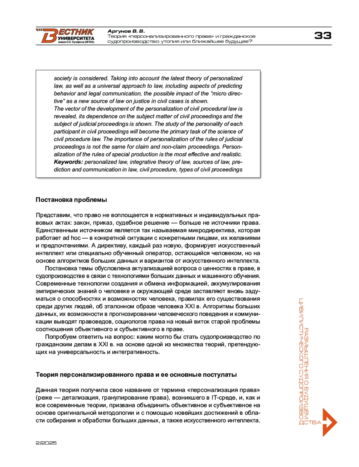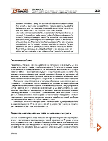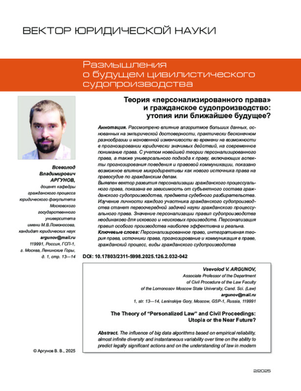 Рассмотрено влияние алгоритмов больших данных, основанных на эмпирической достоверности, практически бесконечном разнообразии и мгновенной изменчивости во времени на возможности в прогнозировании юридически значимых действий, на современное понимание права. С учетом новейшей теории персонализированного права, а также универсального подхода к праву, включающих аспекты прогнозирования поведения и правовой коммуникации, показано возможное влияние микродирективы как нового источника права на правосудие по гражданским делам.