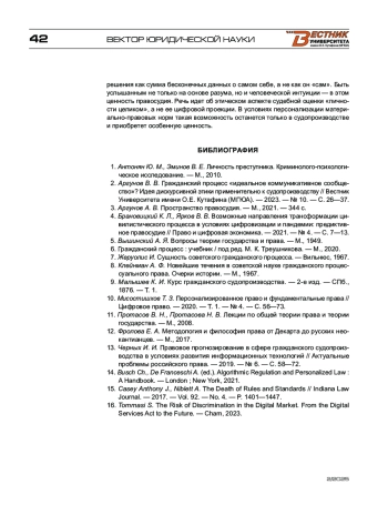 4. Брановицкий К. Л., Ярков В. В. Возможные направления трансформации цивилистического процесса в условиях цифровизации и пандемии: предиктивное правосудие // Право и цифровая экономика. - 2021. - № 4. - С. 7-13.
