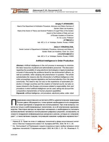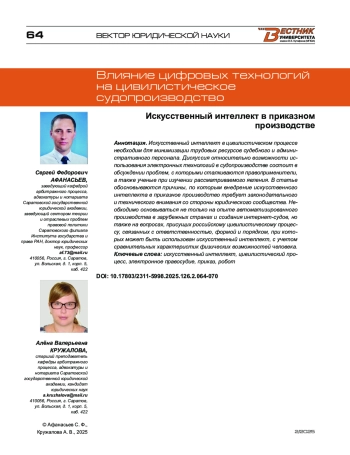 Искусственный интеллект в цивилистическом процессе необходим для минимизации трудовых ресурсов судебного и административного персонала. Дискуссия относительно возможности использования электронных технологий в судопроизводстве состоит в обсуждении проблем, с которыми сталкиваются правоприменители, а также ученые при изучении рассматриваемого явления. В статье обосновываются причины, по которым внедрение искусственного интеллекта в приказное производство требует законодательного и технического внимания со стороны юридического сообщества. Необходимо основываться не только на опыте автоматизированного производства в зарубежных странах и создания интернет-судов, но также на вопросах, присущих российскому цивилистическому процессу, связанных с ответственностью, формой и порядком, при которых может быть использован искусственный интеллект, с учетом сравнительных характеристик физических возможностей человека.