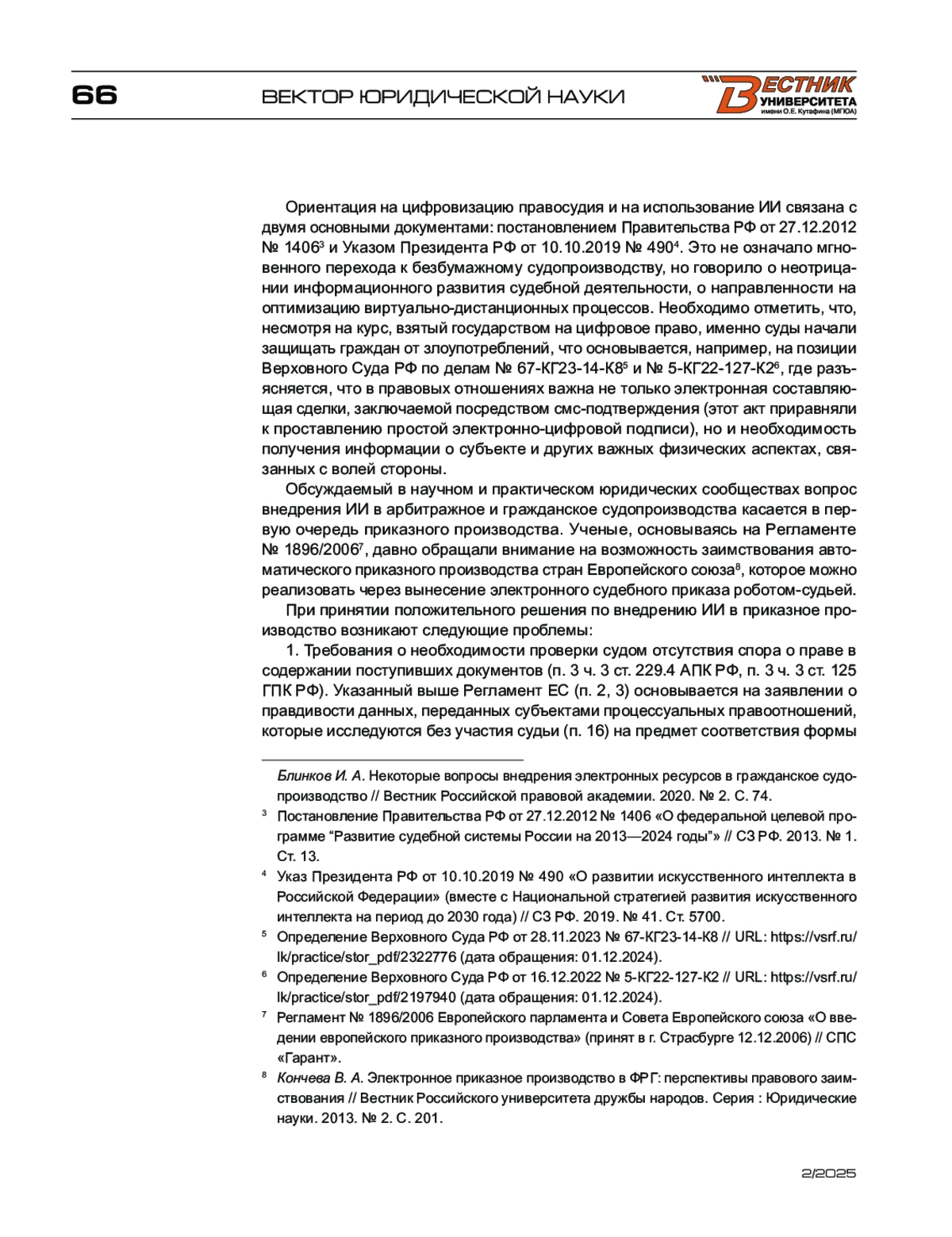 7. Кончева В. А. Электронное приказное производство в ФРГ: перспективы правового заимствования // Вестник Российского университета дружбы народов. - Серия : Юридические науки. - 2013. - № 2. - С. 198-206.