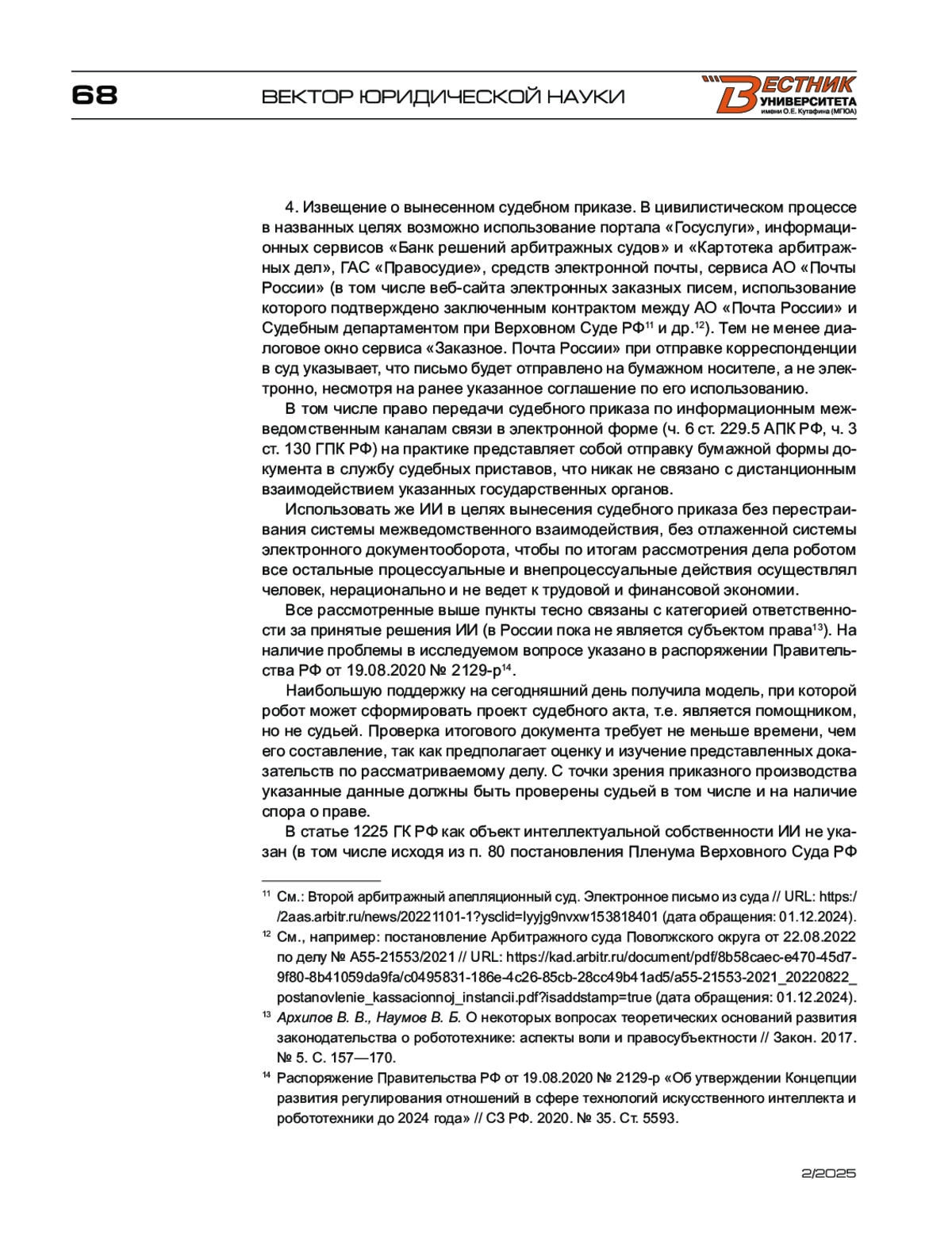 9. Наумов В. Б. Право на отказ от цифровых технологий в сфере искусственного интеллекта // Вестник Университета имени О.Е. Кутафина (МГЮА). - 2024. - № 10. - С. 26-36. - URL: https://doi.org/10.17803/2311-5998.2024.122.10.026-036.