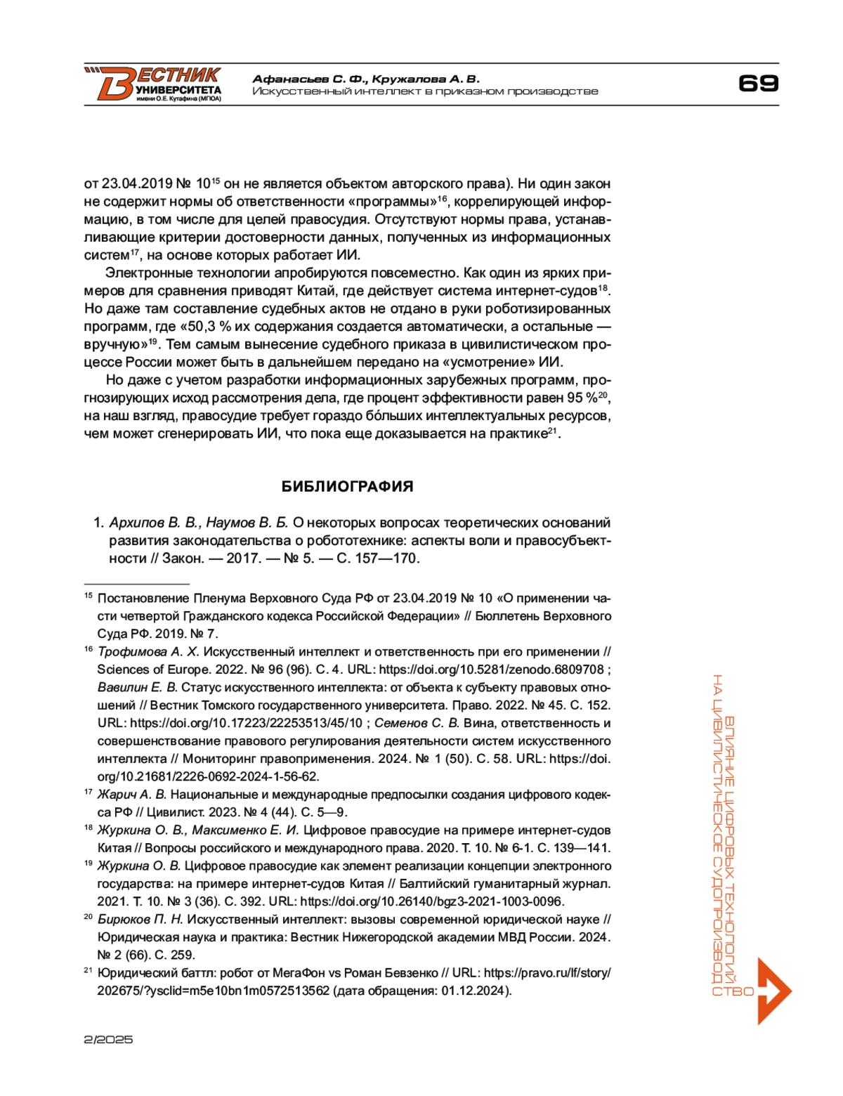 1. Архипов В. В., Наумов В. Б. О некоторых вопросах теоретических оснований развития законодательства о робототехнике: аспекты воли и правосубъектности // Закон. - 2017. - № 5. - С. 157-170.