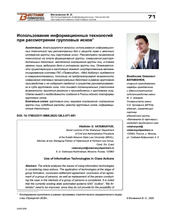 Анализируются вопросы использования информационных технологий при рассмотрении дел о защите прав и законных интересов группы лиц (групповые иски). Рассмотрено применение технологий на этапе формирования группы, совершения распорядительных действий, заключения соглашения группы лиц, а также замены лица, ведущего дело в интересах группы лиц. Отмечается, что существующие в настоящий момент государственные автоматизированные системы ГАС «Правосудие», «Мой Арбитр» нуждаются в совершенствовании, поскольку не предусматривают возможности совершения ключевых процессуальных действий в рамках группового производства и не содержат сведений о существе рассматриваемого в суде группового иска, что лишает потенциальных участников возможности принятия решения о присоединении к групповому иску. Сделан вывод о необходимости создания в России единой платформы групповых исков.