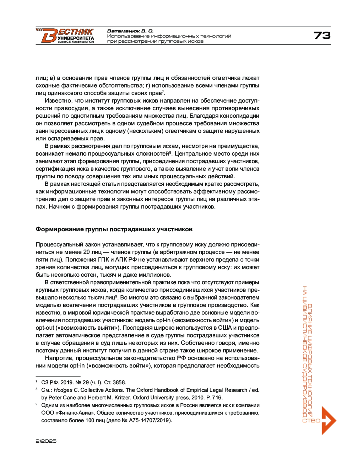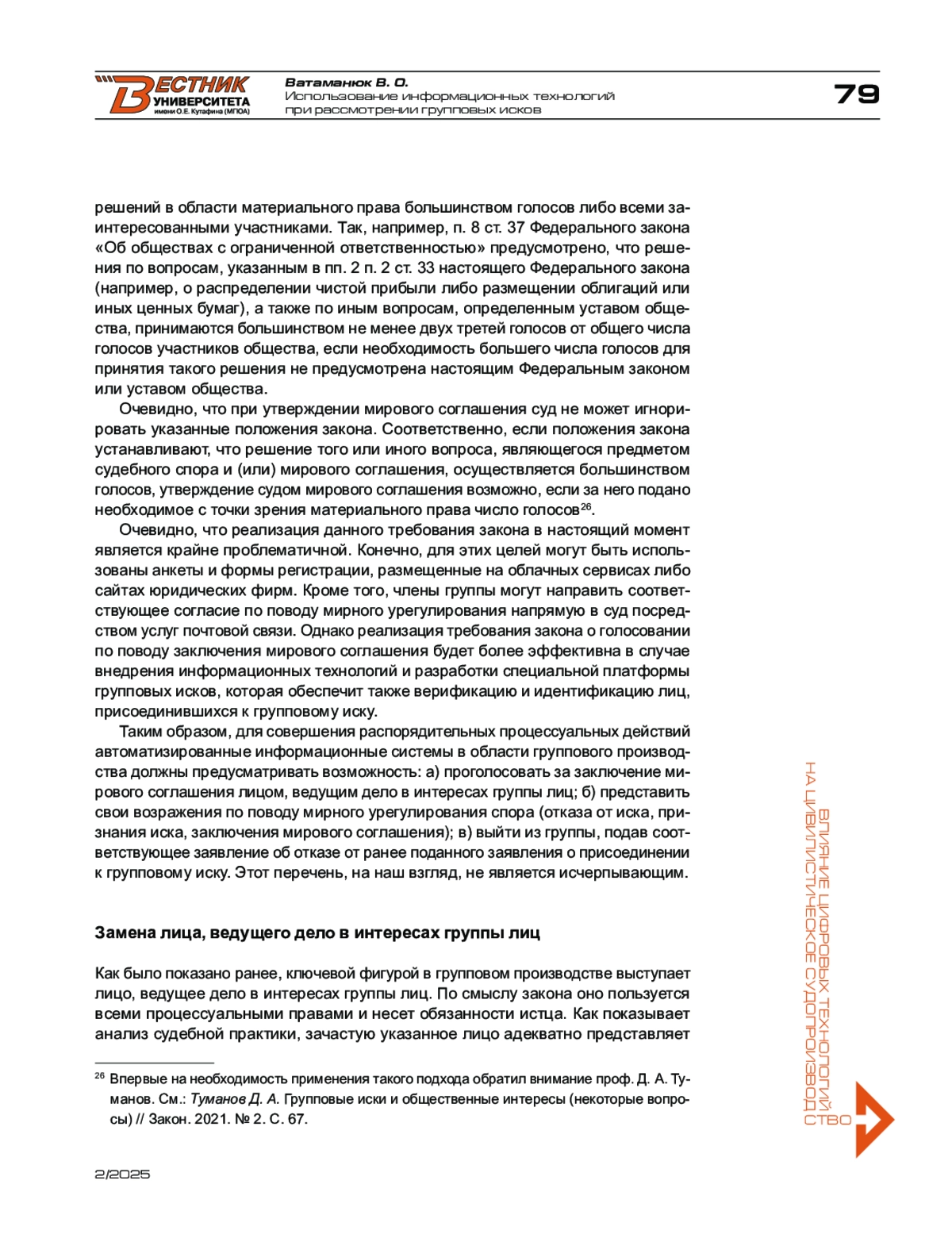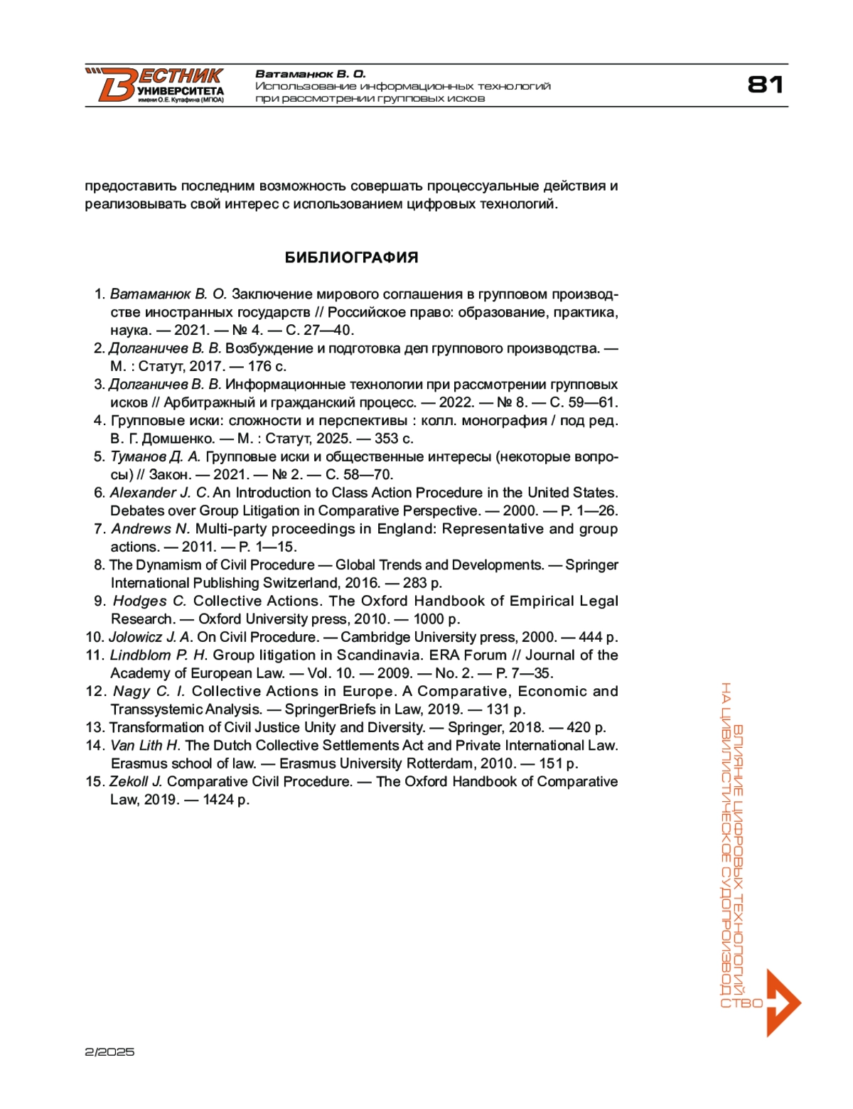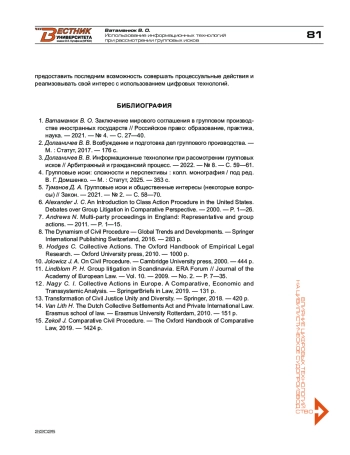 1. Ватаманюк В. О. Заключение мирового соглашения в групповом производстве иностранных государств // Российское право: образование, практика, наука. - 2021. - № 4. - С. 27-40.