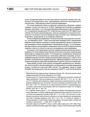 12. Решетникова И. В. Искусственный интеллект в арбитражном процессе: возможные сферы применения» // Вестник гражданского процесса. - 2024. - Т. 14. - № 2. - С. 30-41.