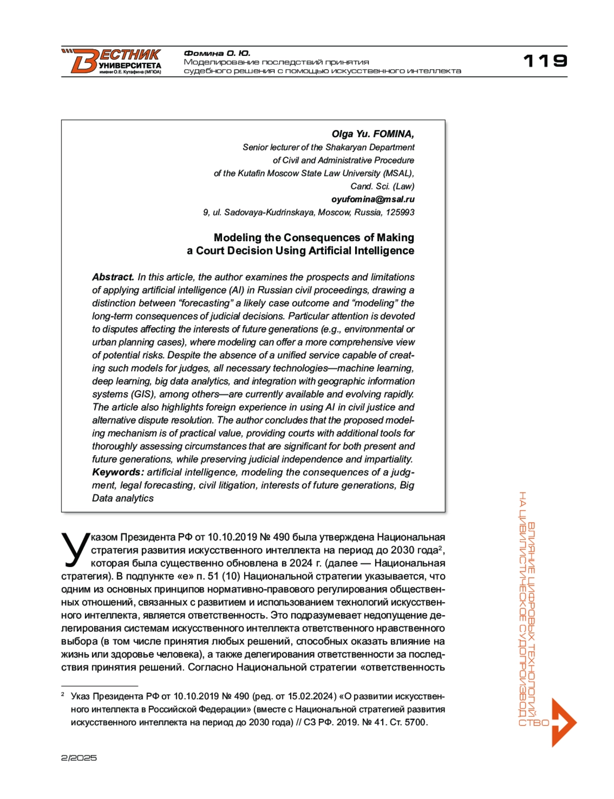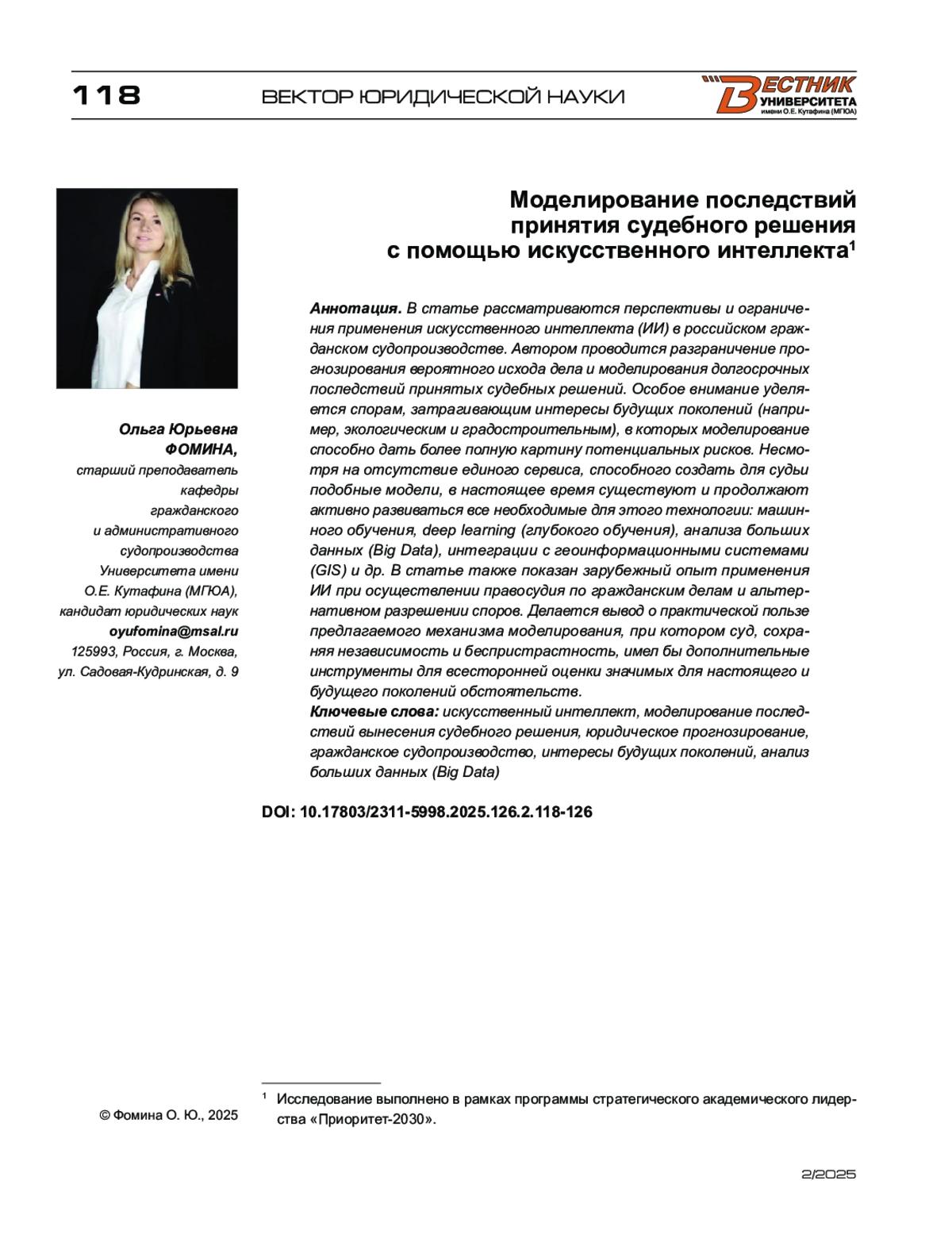 В статье рассматриваются перспективы и ограничения применения искусственного интеллекта (ИИ) в российском гражданском судопроизводстве. Автором проводится разграничение прогнозирования вероятного исхода дела и моделирования долгосрочных последствий принятых судебных решений. Особое внимание уделяется спорам, затрагивающим интересы будущих поколений (напри мер, экологическим и градостроительным), в которых моделирование способно дать более полную картину потенциальных рисков. Несмотря на отсутствие единого сервиса, способного создать для судьи подобные модели, в настоящее время существуют и продолжают активно развиваться все необходимые для этого технологии: машинного обучения, deep learning (глубокого обучения), анализа больших данных (Big Data), интеграции с геоинформационными системами (GIS) и др. В статье также показан зарубежный опыт применения ИИ при осуществлении правосудия по гражданским делам и альтернативном разрешении споров. Делается вывод о практической пользе предлагаемого механизма моделирования, при котором суд, сохраняя независимость и беспристрастность, имел бы дополнительные инструменты для всесторонней оценки значимых для настоящего и будущего поколений обстоятельств.