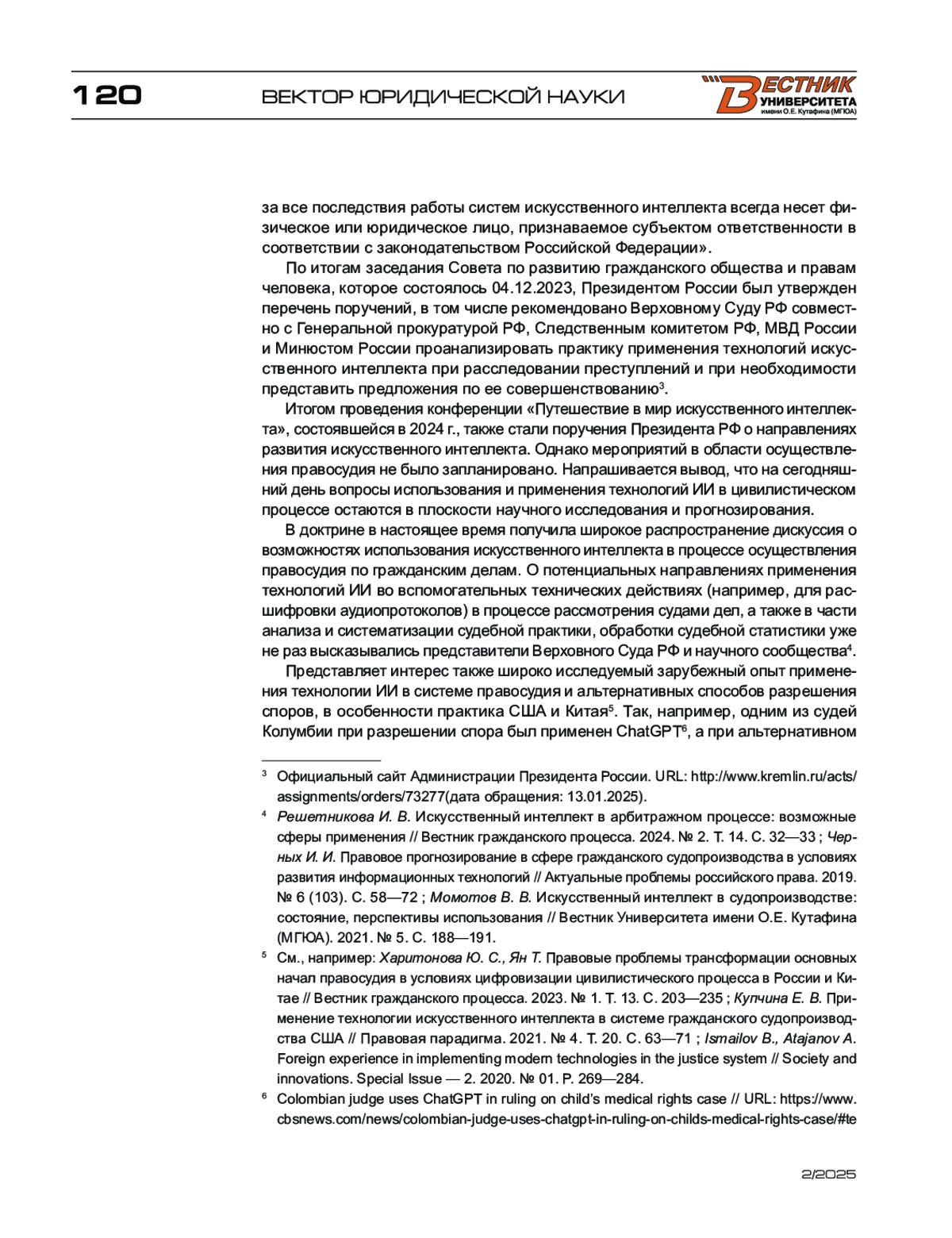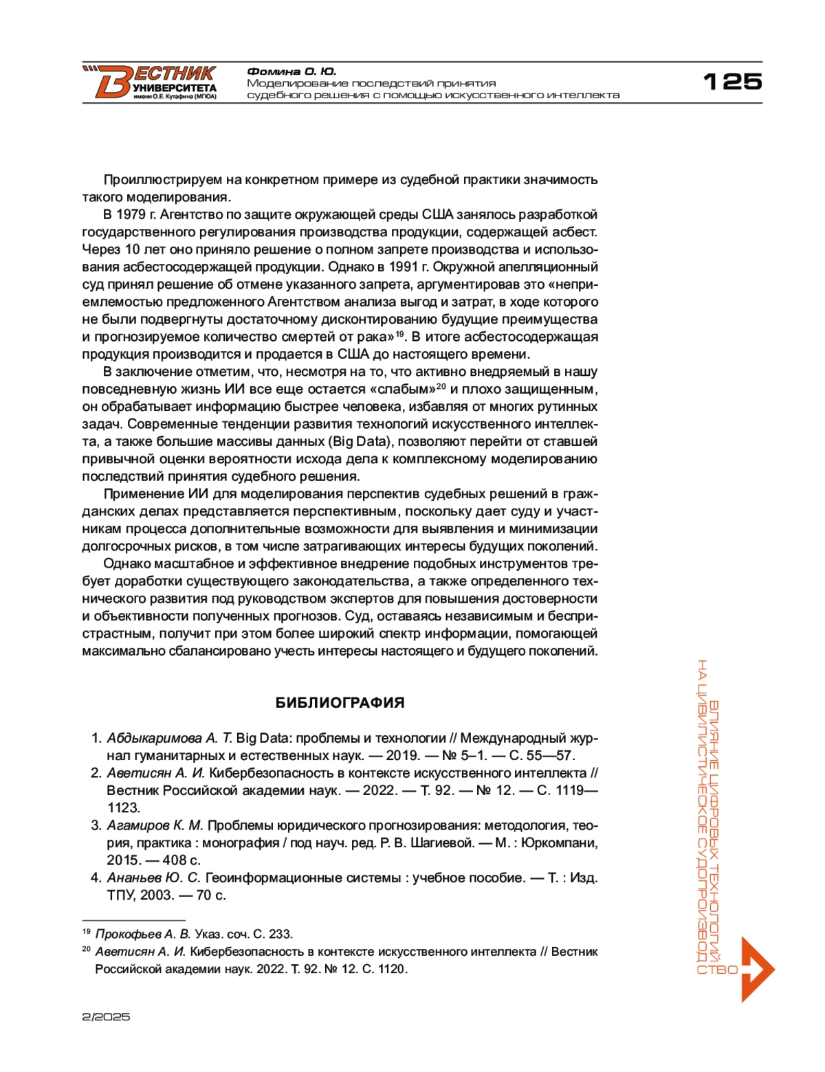 9. Момотов В. В. Искусственный интеллект в судопроизводстве: состояние, перспективы использования // Вестник Университета имени О.Е. Кутафина (МГЮА). - 2021. - № 5. - С. 188-191.