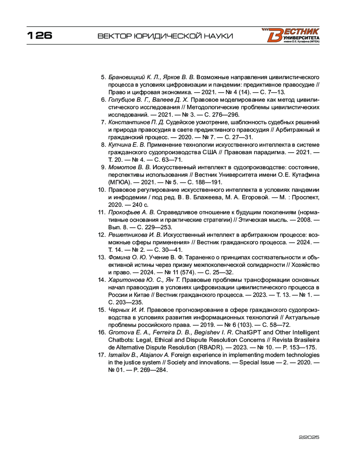 5. Брановицкий К. Л., Ярков В. В. Возможные направления цивилистического процесса в условиях цифровизации и пандемии: предиктивное правосудие // Право и цифровая экономика. - 2021. - № 4 (14). - С. 7-13.