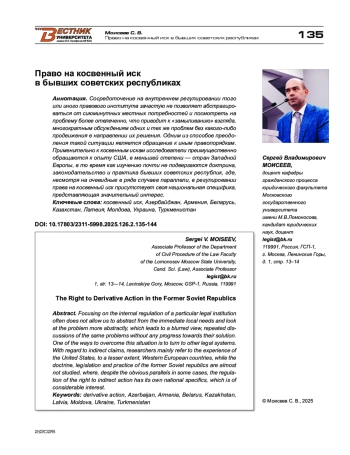 Сосредоточение на внутреннем регулировании того или иного правового института зачастую не позволяет абстрагироваться от сиюминутных местных потребностей и посмотреть на проблему более отвлеченно, что приводит к «замыливанию» взгляда, многократным обсуждениям одних и тех же проблем без какого-либо продвижения в направлении их решения. Одним из способов преодоления такой ситуации является обращение к иным правопорядкам. Применительно к косвенным искам исследователи преимущественно обращаются к опыту США, в меньшей степени — стран Западной Европы, в то время как изучению почти не подвергаются доктрина, законодательство и практика бывших советских республик, где, несмотря на очевидные в ряде случаев параллели, в регулировании права на косвенный иск присутствует своя национальная специфика, представляющая значительный интерес.