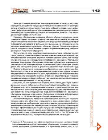 Если п. 3 ст. 49 ГК Республики Беларусь указывает на собственника имущества (учредителей, участников) юридического лица как уполномоченных требовать возмещения причиненных ему убытков, то ч. 7 ст. 33, ст. 57 Закона «О хозяйственных обществах» говорит о предъявлении такого иска в интересах организации самим обществом, его членами совета директоров (наблюдательного совета), а также участниками.