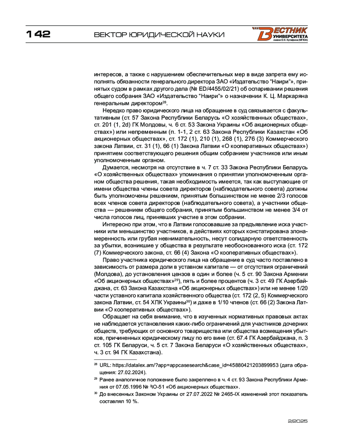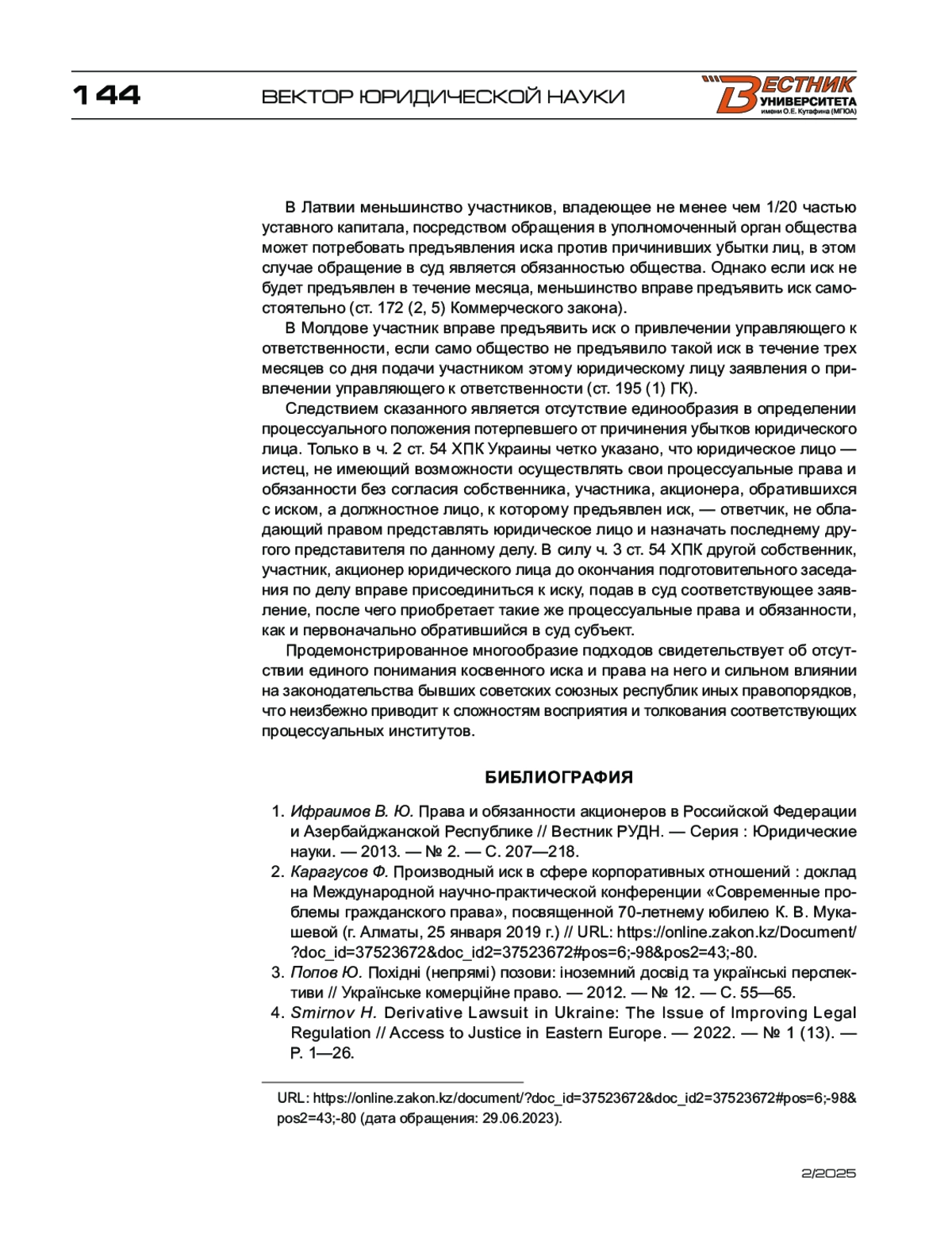 4. Smirnov H. Derivative Lawsuit in Ukraine: The Issue of Improving Legal Regulation // Access to Justice in Eastern Europe. - 2022. - № 1 (13). - P. 1-26.