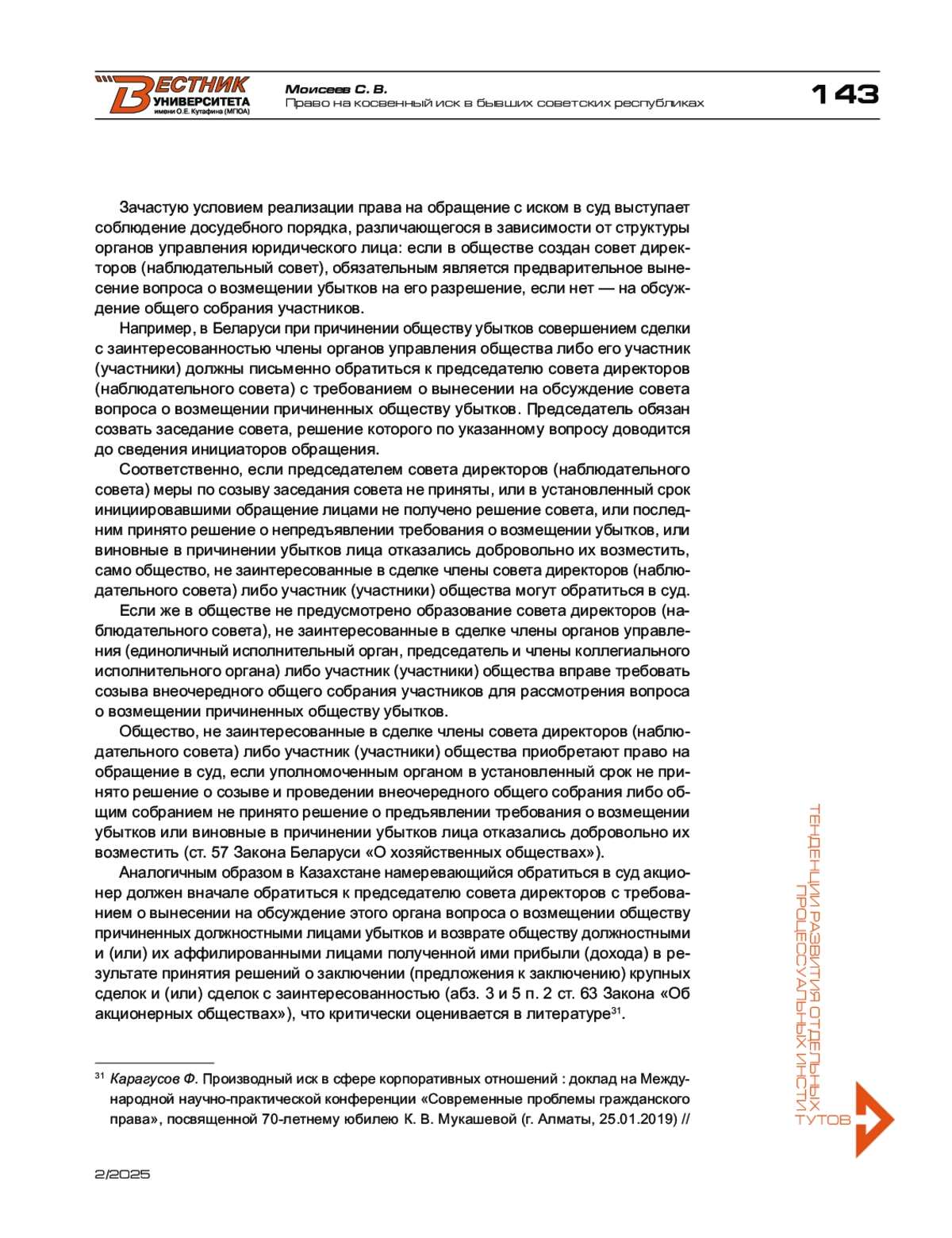 2. Карагусов Ф. Производный иск в сфере корпоративных отношений : доклад на Международной научно-практической конференции «Современные проблемы гражданского права», посвященной 70-летнему юбилею К. В. Мукашевой (г. Алматы, 25 января 2019 г.) // URL: https://online.zakon.kz/Document/?doc_id=37523672&doc_id2=37523672#pos=6;-98&pos2=43;-80.