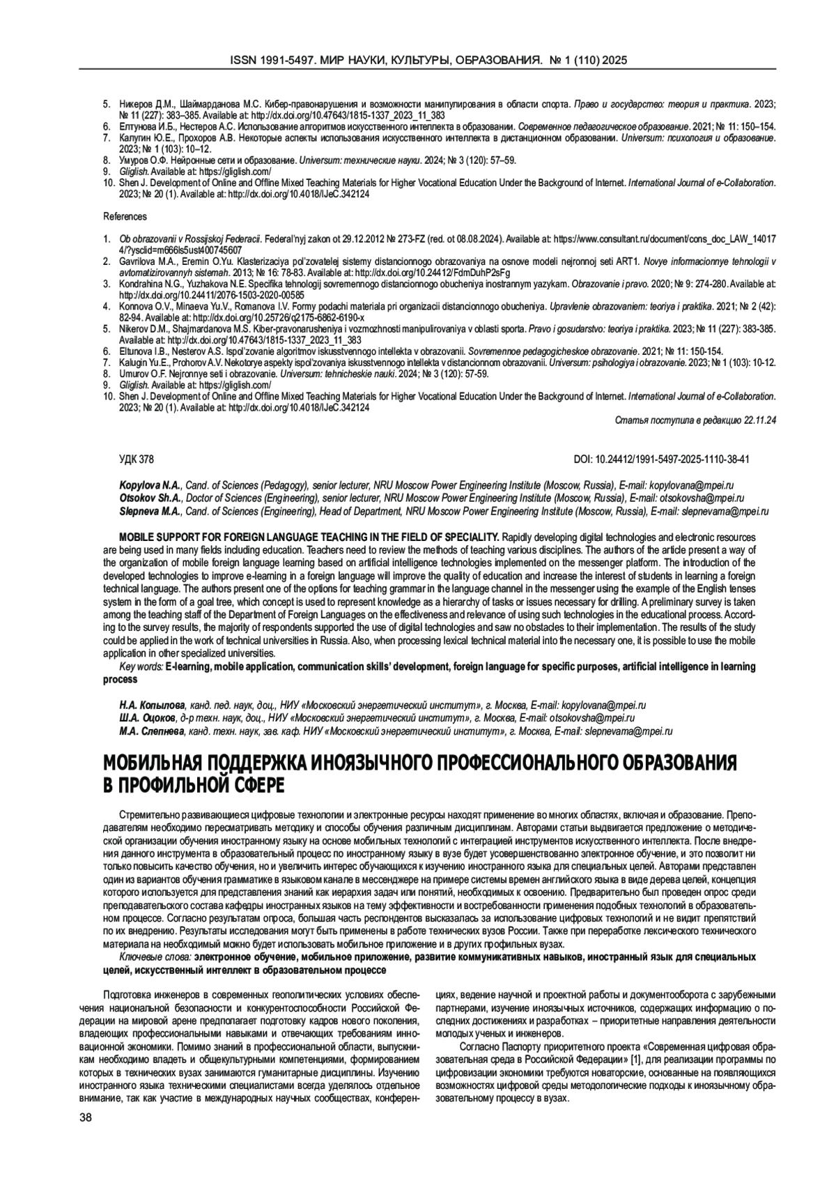7. Калугин Ю.Е., Прохоров А.В. Некоторые аспекты использования искусственного интеллекта в дистанционном образовании. Universum: психология и образование. 2023; № 1 (103): 10-12. EDN: IMONIS