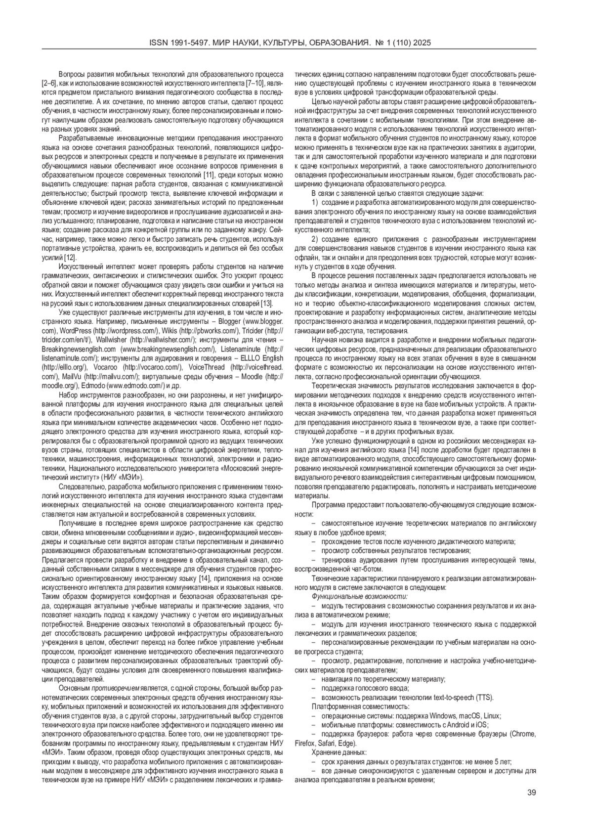 Стремительно развивающиеся цифровые технологии и электронные ресурсы находят применение во многих областях, включая и образование. Преподавателям необходимо пересматривать методику и способы обучения различным дисциплинам. Авторами статьи выдвигается предложение о методической организации обучения иностранному языку на основе мобильных технологий с интеграцией инструментов искусственного интеллекта. После внедрения данного инструмента в образовательный процесс по иностранному языку в вузе будет усовершенствованно электронное обучение, и это позволит ни только повысить качество обучения, но и увеличить интерес обучающихся к изучению иностранного языка для специальных целей. Авторами представлен один из вариантов обучения грамматике в языковом канале в мессенджере на примере системы времен английского языка в виде дерева целей, концепция которого используется для представления знаний как иерархия задач или понятий, необходимых к освоению. Предварительно был проведен опрос среди преподавательского состава кафедры иностранных языков на тему эффективности и востребованности применения подобных технологий в образовательном процессе. Согласно результатам опроса, большая часть респондентов высказалась за использование цифровых технологий и не видит препятствий по их внедрению. Результаты исследования могут быть применены в работе технических вузов России. Также при переработке лексического технического материала на необходимый можно будет использовать мобильное приложение и в других профильных вузах.