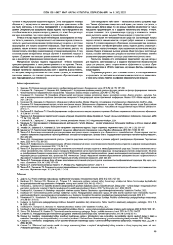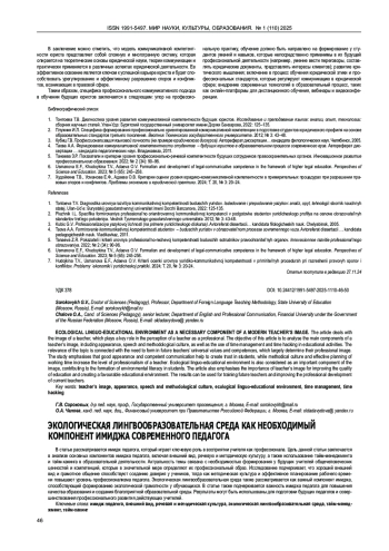 13. Чалова О.А. Формирование экологической культуры студентов средствами иностранного языка в условиях цифровой трансформации образования. Перспективы науки. 2023; № 11 (170): 389-393. EDN: BLMQAG