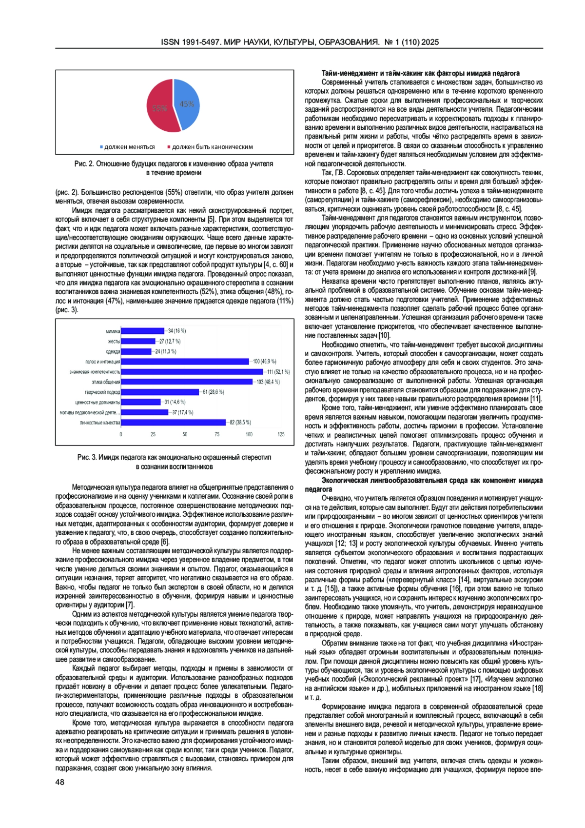 В статье рассматривается имидж педагога, который играет ключевую роль в восприятии учителя как профессионала. Цель данной статьи заключается в анализе основных компонентов имиджа педагога, включая внешний вид, речевую и методическую культуру, а также использование тайм-менеджмента и тайм-хакинга в образовательной деятельности. Актуальность темы связана с необходимостью формирования у будущих учителей общечеловеческих ценностей и компетенций, которые в значительной мере определяют их профессиональный образ. Исследование подчеркивает, что хороший внешний вид и грамотное общение способствуют созданию доверия у учеников, тогда как методическая культура и эффективное планирование рабочего времени повышают уровень профессионализма педагога. Экологическая лингвообразовательная среда также рассматривается как важный компонент имиджа, способствующий формированию экологической грамотности у обучающихся. В статье также подчеркивается важность имиджа педагога для повышения качества образования и создания благоприятной образовательной среды. Результаты могут быть использованы для подготовки будущих педагогов и совершенствования профессионального развития действующих учителей.