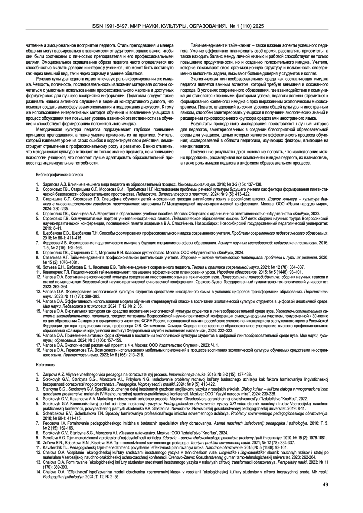 В современном мире имидж педагога очень важен в образовательном пространстве школы, вуза и других образовательных учреждениях. Влияние имиджа педагога распространяется на восприятие учителя как профессионала. Глобальные перемены в обществе, вызванные новыми тенденциями, включая цифровизацию, глобализацию и трансформацию всех образовательных стандартов, указывают на необходимость исследования имиджа педагога и всех его основных компонентов, выделяя экологическую лингвообразовательную среду.