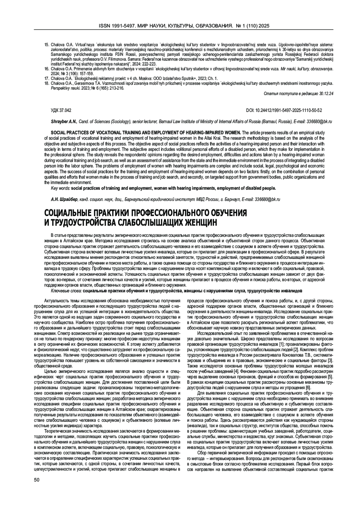 В статье представлены результаты эмпирического исследования социальных практик профессионального обучения и трудоустройства слабослышащих женщин в Алтайском крае. Методика исследования строилась на основе анализа объективной и субъективной сторон данного процесса. Объективная сторона социальных практик отражает деятельность слабослышащего человека и его взаимодействие с социумом в аспекте обучения и трудоустройства. Субъективная сторона включает волевые личностные усилия инвалида, которые он прилагает для реализации в профессиональной сфере. В результате исследования выявлены мнения респондентов относительно желаемой занятости, трудностей и действий, предпринимаемых слабослышащей женщиной при профессиональном обучении и поиске места работы, а также оценка помощи со стороны государства и ближнего окружения в процессе интеграции инвалида в трудовую сферу. Проблемы трудоустройства женщин с нарушением слуха носят комплексный характер и включают в себя социальный, правовой, психологический и экономический аспекты. Успешность социальных практик обучения и трудоустройства слабослышащих женщин зависит от двух факторов: во-первых, от сочетания личностных качеств и усилий, которые женщины прилагают в процессе обучения и поиска работы, во-вторых, от адресной поддержки органов власти, общественных организаций и ближнего окружения.