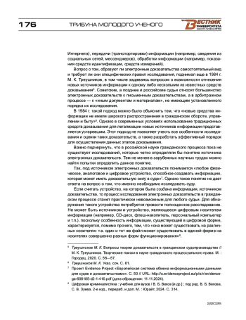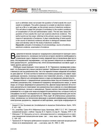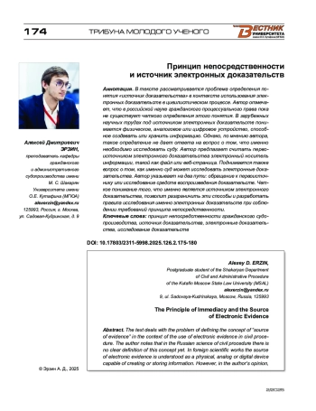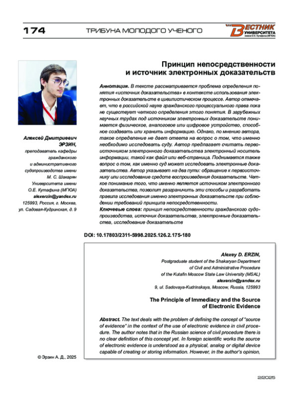 В тексте рассматривается проблема определения понятия «источник доказательства» в контексте использования электронных доказательств в цивилистическом процессе. Автор отмечает, что в российской науке гражданского процессуального права пока не существует четкого определения этого понятия. В зарубежных научных трудах под источником электронных доказательств пони мается физическое, аналоговое или цифровое устройство, способное создавать или хранить информацию. Однако, по мнению автора, такое определение не дает ответа на вопрос о том, что именно необходимо исследовать суду. Автор предлагает считать первоисточником электронного доказательства электронный носитель информации, такой как файл или веб-страница. Поднимается также вопрос о том, как именно суд может исследовать электронные доказательства. Автор указывает на два пути: обращение к первоисточнику или исследование средств воспроизведения доказательств. Чет кое понимание того, что именно является источником электронного доказательства, позволит разграничить эти способы и разработать правила исследования именно электронных доказательств при соблюдении требований принципа непосредственности.