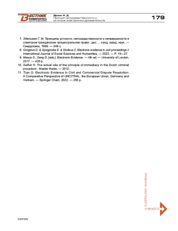 8. Gorgieva D. & Gjorgjioska E. & Stoileva Z. Electronic evidence in civil proceedings // International Journal of Social Sciences and Humanities. - 2023. - P. 19-27.