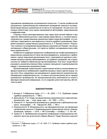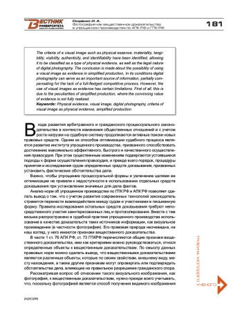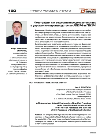 Неоднозначность правовой природы визуального изображения требует рассмотрения возможности его отнесения к вещественным доказательствам, а также применимости визуального изображения как вещественного доказательства в упрощенном производстве в условиях развития и изменения арбитражного и гражданского процессуального законодательства. Выявлены критерии визуального изображения, такие как физическая сущность, материальность осязаемость, наглядность, аутентичность, идентифицируемость, позволяющие отнести его к разновидности вещественного доказательства, а также правовая природа цифровой фотографии. Сделан вывод о возможности использования визуального изображения в качестве доказательства в упрощенном производстве. В его условиях цифровая фотография может служить важным источником информации, частично компенсируя отсутствие полноценного состязательного процесса. Вместе с тем использование визуальных изображений как доказательства имеет определенные ограничения. Прежде всего это связано с особенностями упрощенного производства, где убеждающее значение доказательств реализуется не в полной мере.