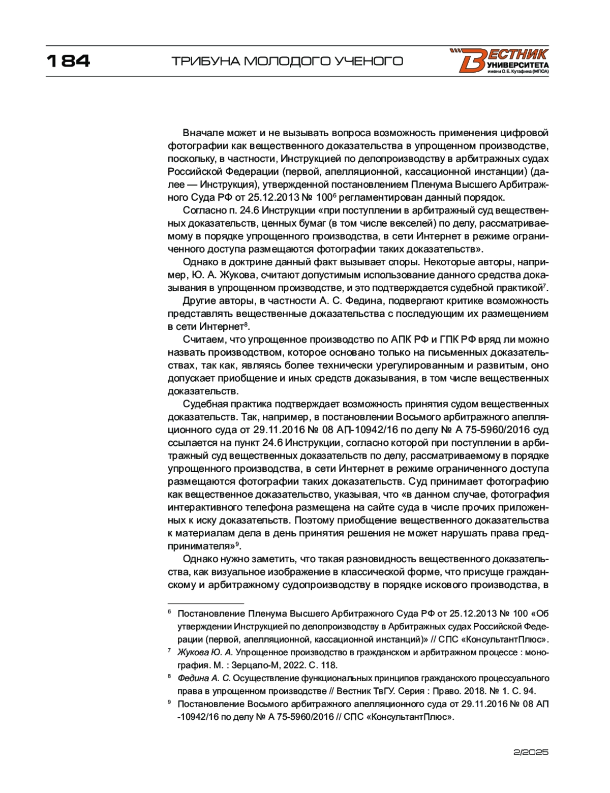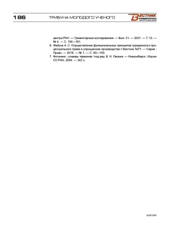 6. Федина А. С. Осуществление функциональных принципов гражданского процессуального права в упрощенном производстве // Вестник ТвГУ. - Серия : Право. - 2018. - № 1. - С. 90-100.