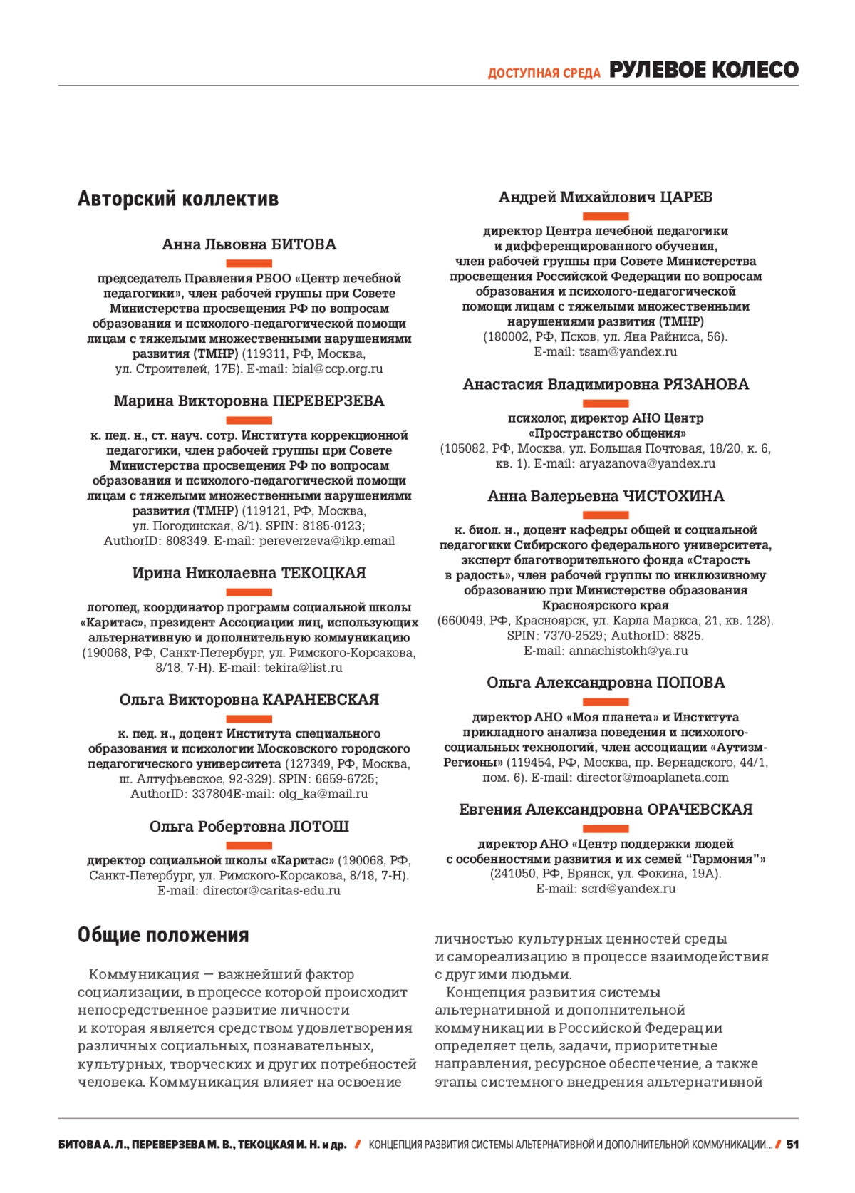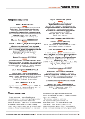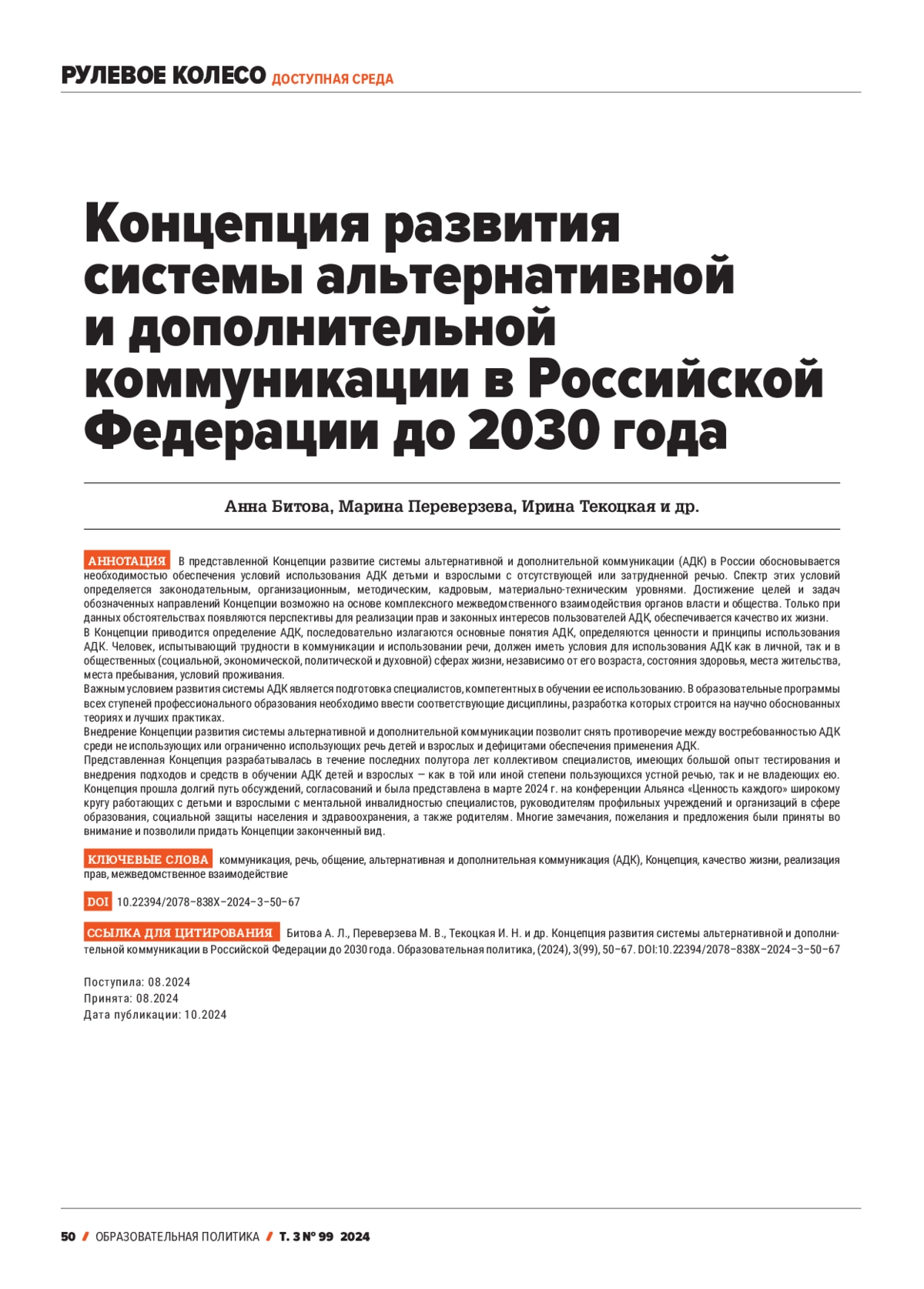 В представленной Концепции развитие системы альтернативной и дополнительной коммуникации (АДК) в России обосновывается необходимостью обеспечения условий использования АДК детьми и взрослыми с отсутствующей или затрудненной речью. Спектр этих условий определяется законодательным, организационным, методическим, кадровым, материально-техническим уровнями. Достижение целей и задач обозначенных направлений Концепции возможно на основе комплексного межведомственного взаимодействия органов власти и общества. Только при данных обстоятельствах появляются перспективы для реализации прав и законных интересов пользователей АДК, обеспечивается качество их жизни. В Концепции приводится определение АДК, последовательно излагаются основные понятия АДК, определяются ценности и принципы использования АДК. Человек, испытывающий трудности в коммуникации и использовании речи, должен иметь условия для использования АДК как в личной, так и в общественных (социальной, экономической, политической и духовной) сферах жизни, независимо от его возраста, состояния здоровья, места жительства, места пребывания, условий проживания. Важным условием развития системы АДК является подготовка специалистов, компетентных в обучении ее использованию. В образовательные программы всех ступеней профессионального образования необходимо ввести соответствующие дисциплины, разработка которых строится на научно обоснованных теориях и лучших практиках. Внедрение Концепции развития системы альтернативной и дополнительной коммуникации позволит снять противоречие между востребованностью АДК среди не использующих или ограниченно использующих речь детей и взрослых и дефицитами обеспечения применения АДК. Представленная Концепция разрабатывалась в течение последних полутора лет коллективом специалистов, имеющих большой опыт тестирования и внедрения подходов и средств в обучении АДК детей и взрослых - как в той или иной степени пользующихся устной речью, так и не владеющих ею. Концепция прошла долгий путь обсуждений, согласований и была представлена в марте 2024 г. на конференции Альянса «Ценность каждого» широкому кругу работающих с детьми и взрослыми с ментальной инвалидностью специалистов, руководителям профильных учреждений и организаций в сфере образования, социальной защиты населения и здравоохранения, а также родителям. Многие замечания, пожелания и предложения были приняты во внимание и позволили придать Концепции законченный вид.