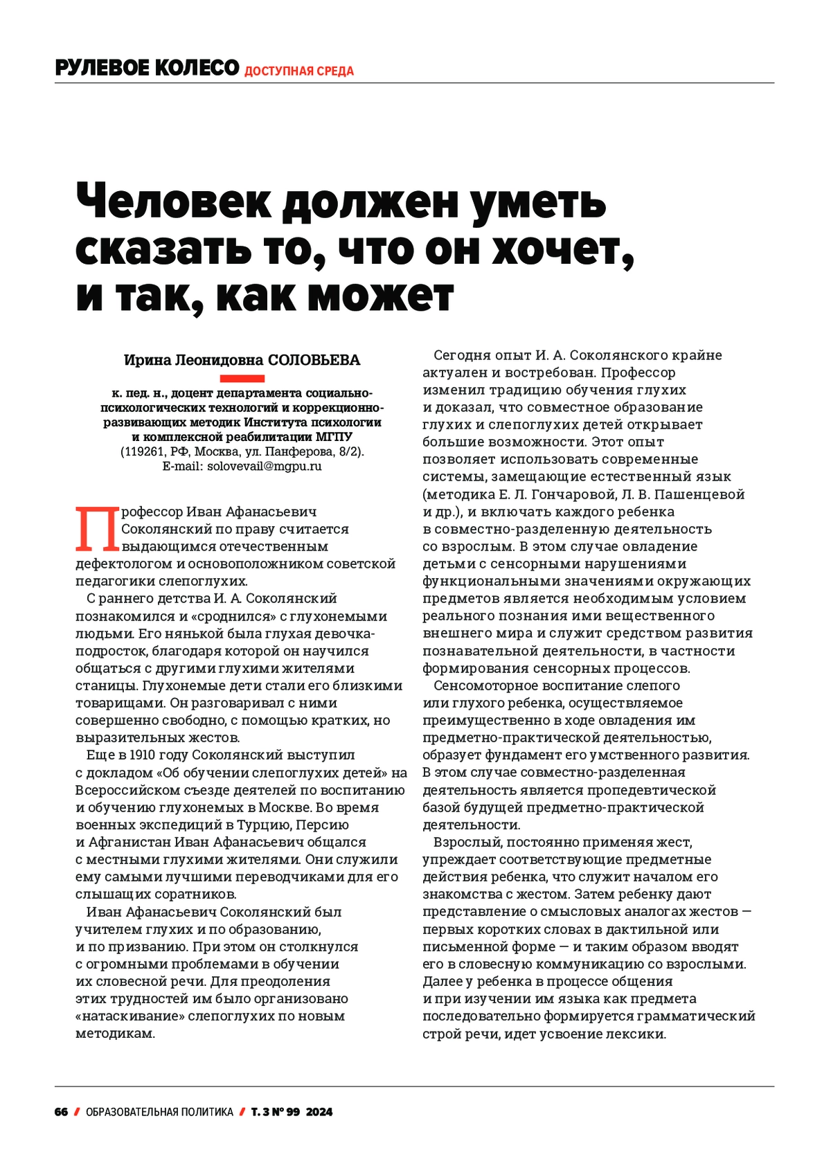 СОЛОВЬЕВА И. Л. ЧЕЛОВЕК ДОЛЖЕН УМЕТЬ СКАЗАТЬ ТО, ЧТО ОН ХОЧЕТ, И ТАК, КАК МОЖЕТ // ОБРАЗОВАТЕЛЬНАЯ ПОЛИТИКА. 2024. № 3 (99)