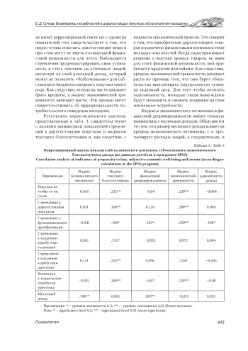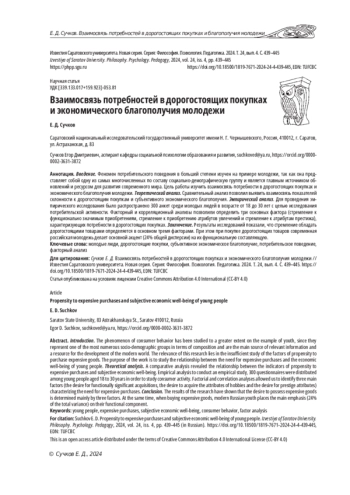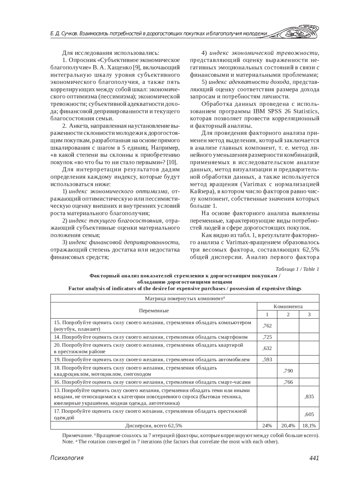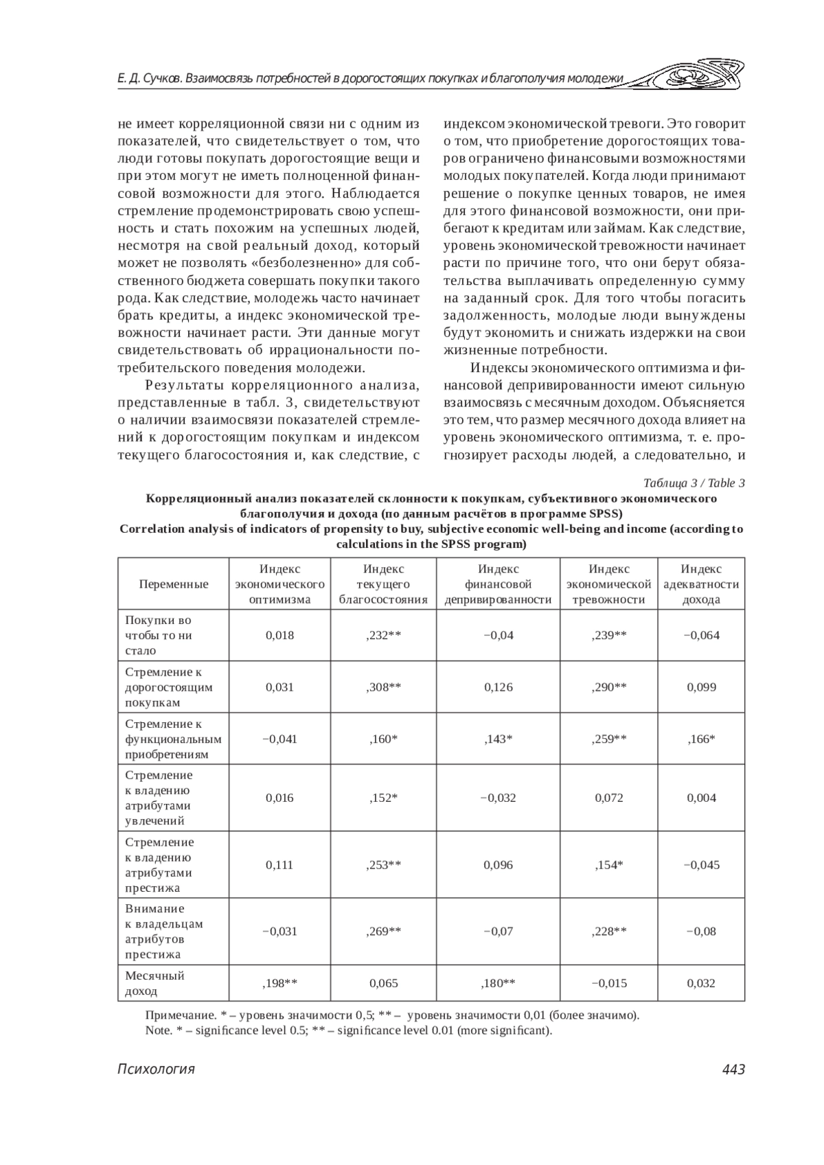 Введение. Феномен потребительского поведения в большей степени изучен на примере молодежи, так как она представляет собой одну из самых многочисленных по составу социально-демографическую группу и является главным источником обновлений и ресурсом для развития современного мира. Цель работы изучить взаимосвязь потребности в дорогостоящих покупках и экономического благополучия молодежи. Теоретический анализ. Сравнительный анализ позволил выявить взаимосвязь показателей склонности к дорогостоящим покупкам и субъективного экономического благополучия. Эмпирический анализ. Для проведения эмпирического исследования было распространено 300 анкет среди молодых людей в возрасте от 18 до 30 лет с целью исследования потребительской активности. Факторный и корреляционный анализы позволили определить три основных фактора (стремление к функционально значимым приобретениям, стремление к приобретению атрибутов увлечений и стремление к атрибутам престижа), характеризующих потребности в дорогостоящих покупках.
