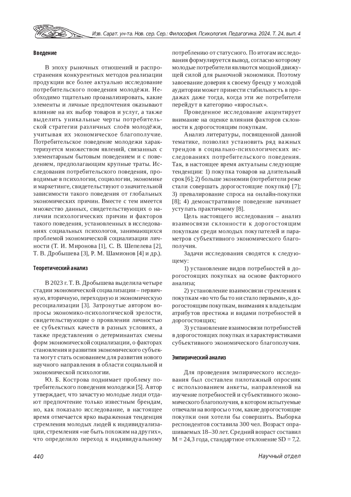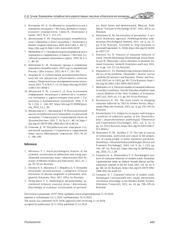 10. Шамионов Р. М., Сучков Е. Д. Роль источников информации, мотивации и ценностей в склонности молодежи к дорогостоящим покупкам // Социальная и экономическая психология. 2024. Т. 9, № 1 (33). С. 164-187. DOI: 10.38098/ipran.sep_2024_33_1_08 EDN: WKRJRM