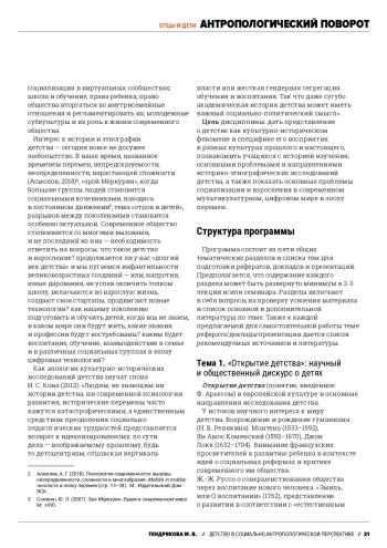 Предлагаемая программа показывает разнообразие подходов к детской тематике в дискурсе гуманитарных наук, в этнологии / социальной антропологии, в истории, психологии, археологии, фольклористике. По мере возможности в ней реализуется междисциплинарный подход. Методологической базой выступает культурно-историческая теория Л. С. Выготского, А. Н. Леонтьева и А. Р. Лурии, позволяющая объединить широкий круг этнографических, исторических и психологических исследований. В программе затрагивается следующий круг вопросов: основные подходы и направления исследования детей и детства, существующие в зарубежной и отечественной науке; неоднозначность понимания в различных культурах в различные исторические эпохи таких универсальных явлений, как детство, взросление, социализация, развитие ребенка в когнитивном и в моральном плане, инновационный потенциал детства и его роль в развитии общества в целом. Также исследуются проблемы, связанные с детством в современном мире, а именно: отношения между поколениями; социализация в виртуальных сообществах; проблема школы и обучения; права ребенка; право общества вторгаться во внутрисемейные отношения и регламентировать их; молодежные субкультуры и их роль в жизни современного общества. Интерес к истории и этнографии детства - сегодня вовсе не досужее любопытство. В наше время, названное временем перемен, непредсказуемости, неопределенности, нарастающей сложности, тема «отцов и детей», разрывов между поколениями становится особенно актуальной. Современное общество сталкивается со многими вызовами: что такое детство и взросление? продолжается ли у нас «долгий век детства» и мы пугаемся инфантильности великовозрастных созданий - или, напротив, юные дарования, не успев окончить толком школу, включаются во взрослую жизнь, создают свои стартапы, продвигают новые технологии? как нашему поколению подготовить и обучить детей, когда мы не знаем, в каком мире они будут жить, какие знания и профессии будут востребованы? каким будет воспитание, обучение, взаимодействие в семье и в различных социальных группах в эпоху цифровых технологий?