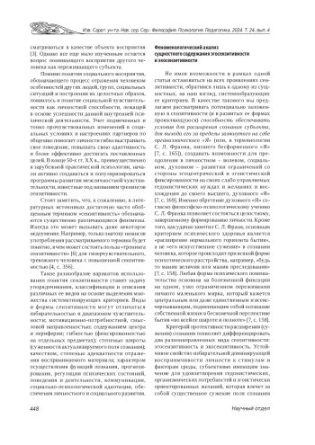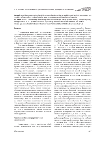 Во введении обосновываются актуальность феноменологического и дифференциального анализа общей способности сензитивности человека, содержание, форма и степень восприимчивости которого трансформируются в условиях возникновения экзистенциальных угроз жизни и возрастания цифровизации. Предпринятый теоретический анализ предметного поля сензитивности позволил выявить существующее, отчасти противоречивое, разнообразие вариантов использования его ключевой категории и сформулировать научную задачу упорядочивания, классификации и описания различных видов сензитивности на основе выделения различных систематизирующих критериев. В разделе, описывающем феноменологический анализ сущностного содержания эгосензитивности и экосензитивности, предложено дифференцирование двух генерализованных видов сензитивности личности, выделяемых на основе сущностного критерия расширения (сужения) сознания, обеспечивающего (ограничивающего) процесс личностного развития, выход за пределы замкнутого на себе организмического «Я», преодоление преград со стороны эгоцентрической и эгоистической фиксированности на своих слабо управляемых гедонистических желаниях и восхождение к духовному «Я». Даются определения эгосензитивнсоти и экосензитивности. Рассматривается роль экосензитивности в формировании способностей самотрансцендентности, экологичности сознания, эмоциональной экологичности личности, потенциала психического здоровья и построении гармоничных взаимоотношений. В заключении подводятся итоги феноменологического анализа экосензитивности и намечаются перспективы ее дальнейшего изучения.
