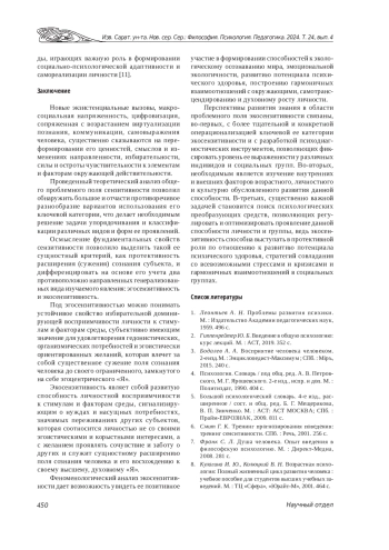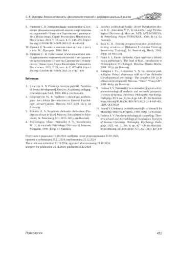 9. Фролова С. В. Эмоциональная экологичность личности: феноменологический анализ и перспективы исследований // Известия Саратовского университета. Новая серия. Серия: Философия. Психология. Педагогика. 2023. Т. 23, вып. 4. С. 445-451. DOI: 10.18500/1819-7671-2023-23-4-445-451 EDN: QCOXQR