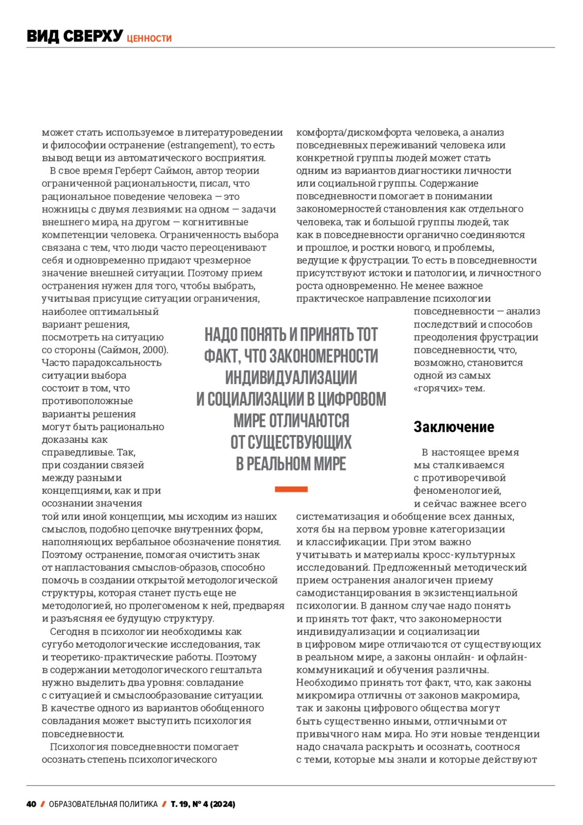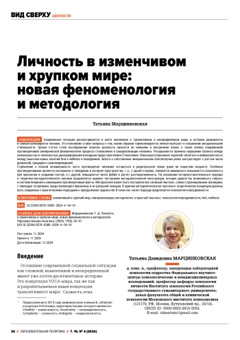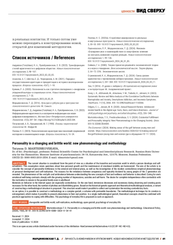 The current situation is considered from the point of view as a situation of the transitive and uncertain world in which a person develops and self-actualizers. This assumption raises questions about how personal growth and the maintenance of emotional stability are harmonized. The aim of the article is to consider the concept of personality brittleness in the external and internal plane, as well as the investigation of the modern contradictory empirical phenomenology of personal development and self-realization. The reasons for the imbalance between uniqueness and typicality declared by young people of the Z generation are revealed. The phenomenon of the «red pill» and ambivalence between understanding the new concepts of brat and wellness and behavior is described. Caring for one’s emotional well-being contrasts sharply with the growing number of depressions, suicides and self-harm. The desire for complete independence often contradicts with the motivation to remain in the parental family even in adulthood. Materials on behavior in the Internet space are especially contradictory. On the one hand, immersion decreases and awareness during observing and creating posts increases On the other hand, the number of phobias and disinhibiting grows. Based on the historical-genetic approach and theoretical-methodological analysis, a variant of constructing a methodological structure is proposed. This structure would make it possible to collect and systematize the existing contradictory facts. As an option, it is possible to construct a methodology as a complex gestalt, a scheme with permeable boundaries. The methodological technique for its creation is estrangement, which makes it possible to present phenomena in their real position. In a single methodological gestalt, theoretical concepts should be combined with practical approaches to coping with difficulties. The psychology of everyday life is proposed as such an approach.