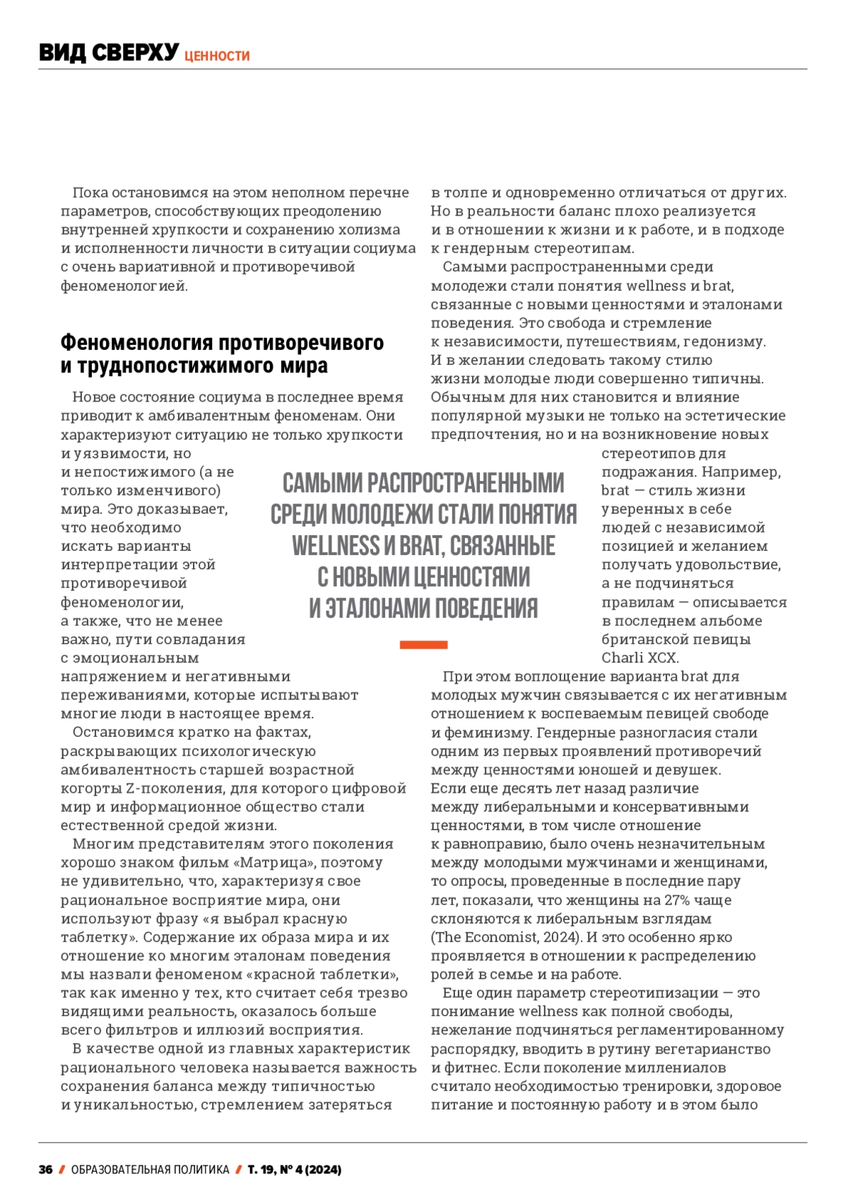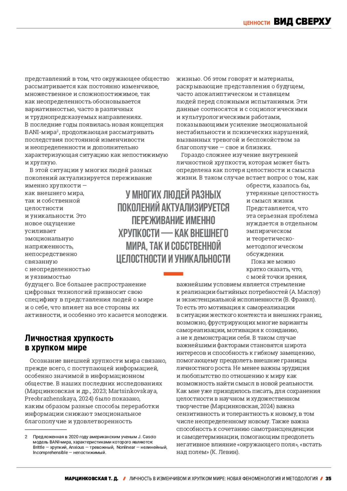 Современная ситуация рассматривается в свете положения о транзитивном и неопределенном мире, в котором развивается и самоактуализируется человек. Это положение ставит вопросы о том, каким образом гармонизируются личностный рост и сохранение эмоциональной стабильности. Целью статьи стало исследование понятия хрупкости личности во внешнем и внутреннем плане, а также анализ современной противоречивой эмпирической феноменологии процесса становления и самореализации человека. Раскрываются причины нарушения баланса между уникальностью и типичностью, декларируемыми молодыми представителями Z-поколения. Описывается феномен «красной таблетки» и амбивалентности между смыслом новых понятий brat и wellness и поведением. Забота о собственном эмоциональном благополучии резко контрастирует с ростом числа депрессий, суицидов и самоповреждений. Стремление к полной независимости часто противоречит желанию оставаться в родительской семье даже во взрослом возрасте. Особенно противоречивыми являются материалы о поведении в интернет-пространстве, т. к., с одной стороны, снижается иммерсия и повышается осознанность при просмотре и создании постов, а с другой, повышается число фобий и растет расторможенность. На основании историко-генетического подхода и теоретико-методологического анализа предлагается вариант построения методологической конструкции, которая давала бы возможность собрать и систематизировать имеющиеся противоречивые факты. Методология может быть построена как сложный гештальт, схема с проницаемыми границами, с помощью остранения, представляющего феномены в их реальной позиции. В едином методологическом гештальте теоретические концепции должны быть соединены с практическими подходами к преодолению трудностей. В качестве такого подхода предлагается психология повседневности.