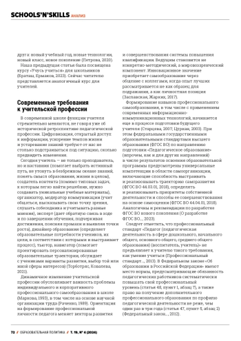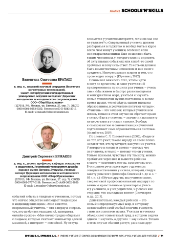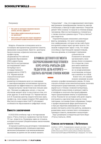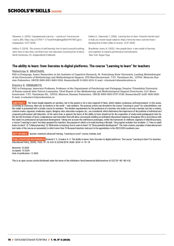 От педагогов во многом зависит будущее, но и в настоящем от них также требуется немало, что предполагает их непрерывное самосовершенствование. В этом смысле, согласно Конфуцию, на свете нет учителей - есть только ученики. Предыдущая статья авторов была посвящена курсу «Учусь учиться» для школьников (Браташ, Ермаков, 2023), сейчас читателю представляется аналогичный курс для педагогов. Рассмотрены современные требования к профессии учителя, который сегодня является не только преподавателем, но и наставником, автором контента, организатором, модератором, экспертом, дизайнером, тьютором, навигатором образования и т. п., что обусловливает важность проблемы индивидуального и корпоративного профессионального самообразования. При этом в основе умения учиться должно лежать не приобретение одного на всю жизнь готового педагогического инструментария, а формирование базовых компетенций и мотивации, позволяющих осознанно выстраивать индивидуальную образовательную траекторию в течение всей жизни в соответствии с потребностями в профессиональном и личностном развитии. С учетом известных прототипов в рамках СберОбразования, детского сегмента, подготовлен курс «Учусь учиться» для педагогов, цель которого - сделать обучение стилем жизни. Программа включает четыре модуля: 1) «Как взрослому научиться учиться»; 2) «Обучение в течение всей жизни»; 3) «Мотивация в обучении: как захотеть учиться»; 4) «Развитие потенциала мозга». Представлены основное содержание и примеры учебных и проверочных заданий курса, в тестировании которого в 2023/2024 учебном году приняли участие более 70 тыс. учителей.