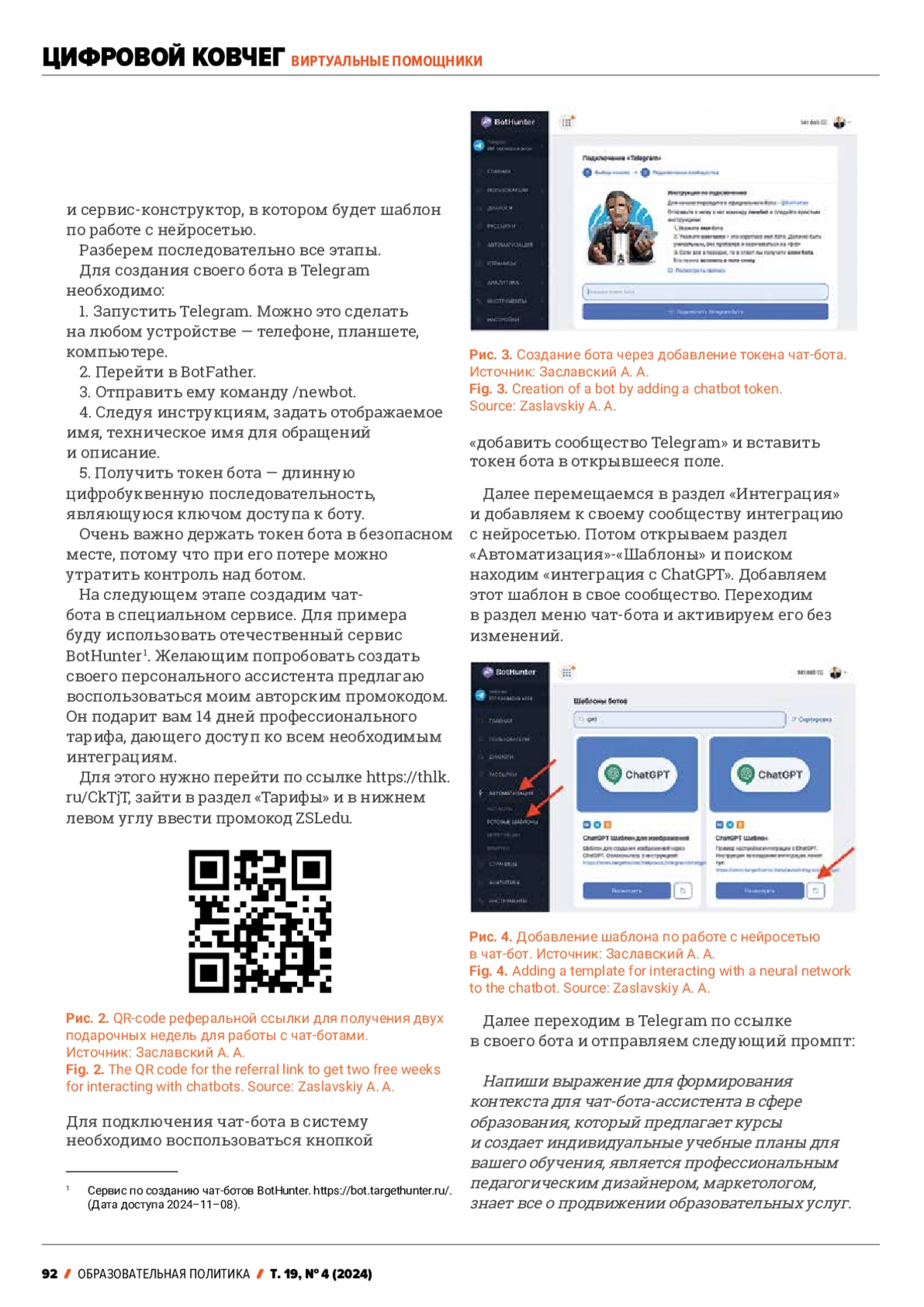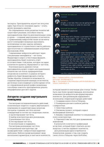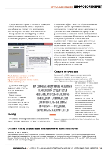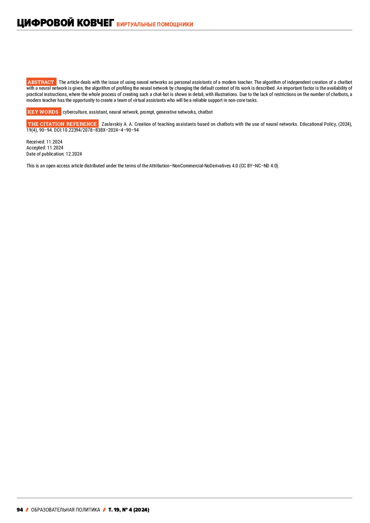 ЗАСЛАВСКИЙ А. А. СОЗДАНИЕ ПРОФИЛЬНЫХ АССИСТЕНТОВ ПЕДАГОГА НА ОСНОВЕ ЧАТ-БОТОВ С ПРИМЕНЕНИЕМ НЕЙРОСЕТЕЙ // ОБРАЗОВАТЕЛЬНАЯ ПОЛИТИКА. 2024. Т. 19 № 4