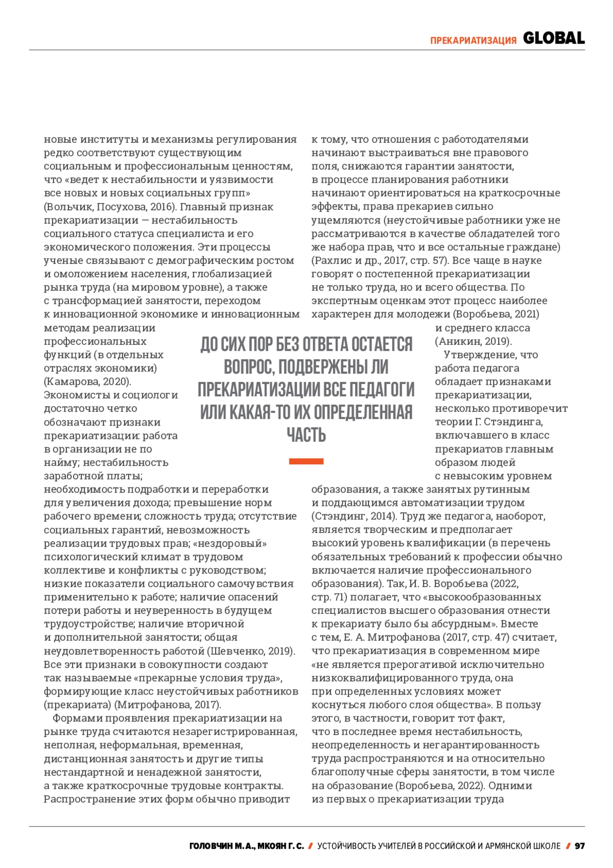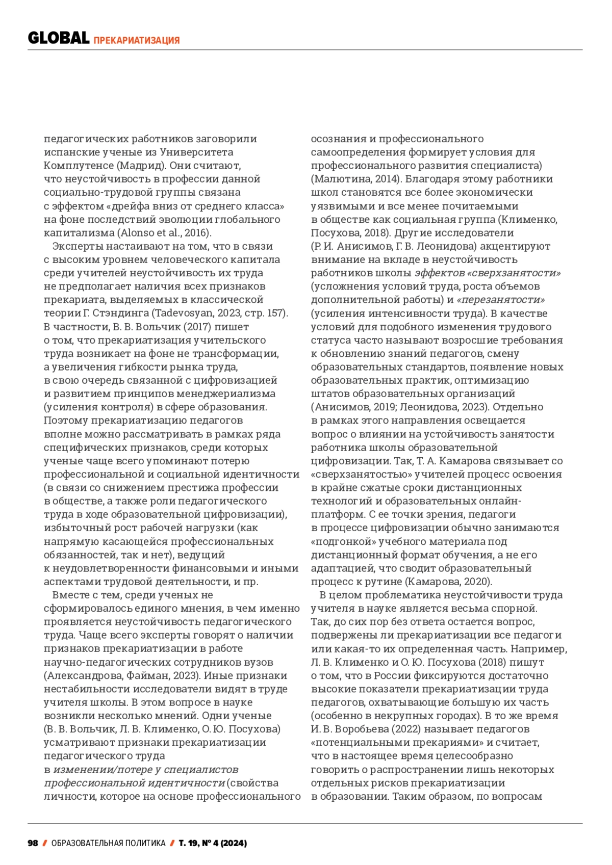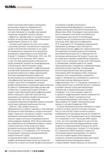 8. Вольчик, В. В., Посухова, О. Ю. (2017). Реформы в сфере образования и прекариатизация учителей. Terra Economicus, 2, 122-138. EDN: YUOWPT