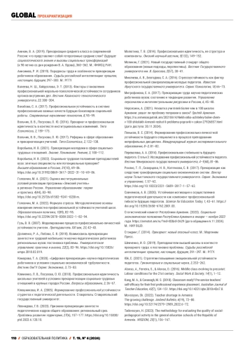 19. Леонидова, Г. В. (2023). Признаки прекаризации занятости педагогических кадров общего образования: региональный срез. Проблемы развития территории, 27(6), 157-177. 10.15838/ ptd.2023.6.128.10. DOI: 10.15838/ptd.2023.6.128.10 EDN: XIQAPM