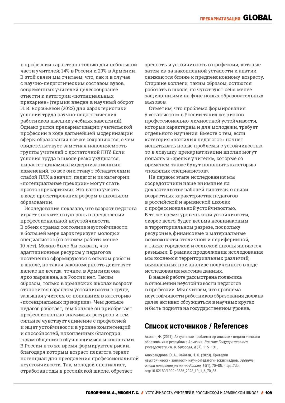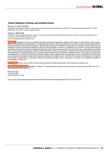 Цель исследования состоит в изучении феномена личностно-профессиональной устойчивости учителей школ. Особое внимание уделено возрасту как фундаменту устойчивости в педагогической профессии. В работе представлен анализ данных социологического опроса, проведенного по единому инструментарию среди учителей, работающих в Российской Федерации (РФ) и Республике Армения (РА). В рамках исследования определены признаки устойчивости в профессии у педагогов, проанализированы их проявления в изучаемых странах. С помощью авторского инструментария проведена оценка профессионально-личностной устойчивости на примере данных социологического опроса. Составлены выводы о проявлении в учительской среде профессионально-личностной неустойчивости (прекариатизации) и роли возраста педагога в преодолении соответствующих признаков. Уровень профессионально-личностной устойчивости педагогов указал на то, что в изучаемых странах еще достаточно рано говорить о массовом распространении признаков прекариатизации в профессии учителя (скорее можно говорить о превращении учителей в «потенциальных прекариев»). В выборке лишь незначительная часть наблюдений обладает слабым уровнем профессионально-личностной устойчивости. Однако процесс утраты учителями с возрастом устойчивости в своей профессии (что особенно заметно на примере России) несет с собой значительные риски прекариатизации. Новизна исследования состоит в разработке подхода к подбору признаков и оценке профессионально-личностной устойчивости, применение которого позволяет формировать новые гипотезы в отношении прекариатизации учительского труда.