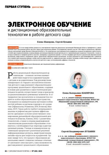 The article presents the results of a survey of teachers of preschool organizations of the Ivanovo region, conducted in order to study the experience of organizing the work of kindergartens in remote mode. The study involved 1,484 teachers of preschool educational organizations of the city of Ivanovo and the Ivanovo region. Based on the survey data, the main difficulties in the work of educators in remote mode, the main forms of organizing educational activities using remote technologies, as well as some features of children’s behavior in classes conducted remotely were identified. Taking into account the specifics of the activities of a preschool educational organization, the directions of work of a preschool educational organization are presented, which are implemented for interaction with a child and his family in a remote mode - online lesson, parent chat, video consultation, Internet challenge, online competition. The variants of the implementation of the main directions of the kindergarten teacher’s work using digital technologies are given.