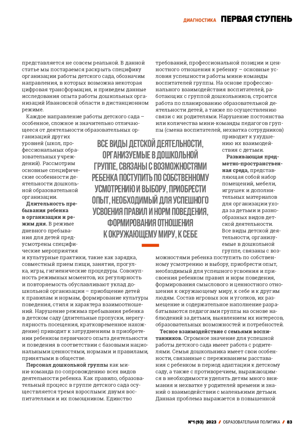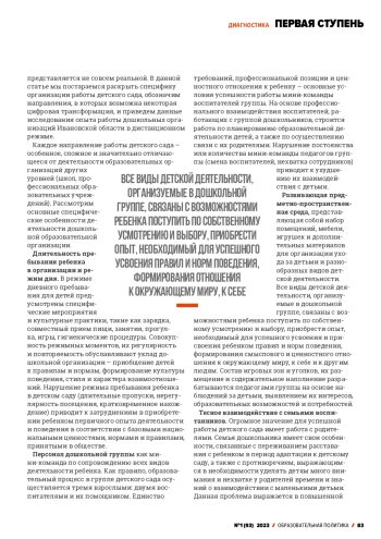 Работа дошкольной образовательной организации – сложная система взаимодействия педагогов и администрации с детьми и их родителями. Под руководством заведующего и старшего воспитателя коллектив детского сада реализует образовательную программу дошкольного образования, создавая условия для развития и самостоятельной деятельности детей, осуществляет уход и присмотр за дошкольниками в режимных моментах. В сотрудничестве воспитателя и специалистов создается особое образовательное пространство, основанное на внимательном изучении особенностей ребенка и научном подходе к его развитию [Афанасьева, Новикова, 2016; Волкова, Махнева, 2017]. Такая работа требует непрерывного анализа и рефлексии для оценки эффективности сделанного и более качественного планирования дальнейшей образовательной деятельности [Гамова, Ханова, 2021].