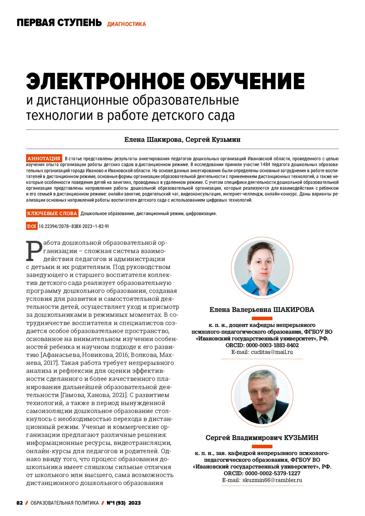 В статье представлены результаты анкетирования педагогов дошкольных организаций Ивановской области, проведенного с целью изучения опыта организации работы детских садов в дистанционном режиме. В исследовании приняли участие 1484 педагога дошкольных образовательных организаций города Иваново и Ивановской области. На основе данных анкетирования были определены основные затруднения в работе воспитателей в дистанционном режиме, основные формы организации образовательной деятельности с применением дистанционных технологий, а также некоторые особенности поведения детей на занятиях, проводимых в удаленном режиме. С учетом специфики деятельности дошкольной образовательной организации представлены направления работы дошкольной образовательной организации, которые реализуются для взаимодействия с ребенком и его семьей в дистанционном режиме: онлайн-занятие, родительский чат, видеоконсультация, интернет-челлендж, онлайн-конкурс. Даны варианты реализации основных направлений работы воспитателя детского сада с использованием цифровых технологий.
