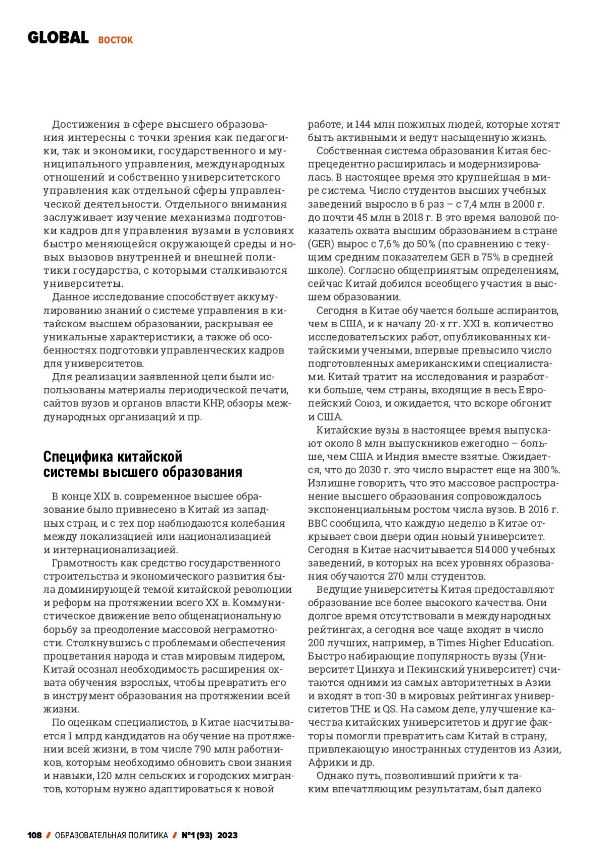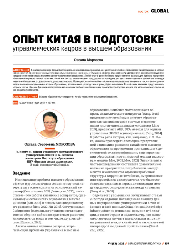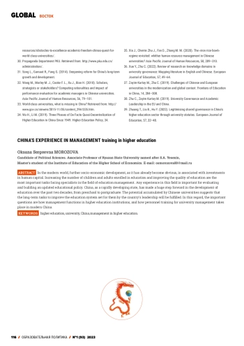 In the modern world, further socio-economic development, as it has already become obvious, is associated with investments in human capital. Increasing the number of children and adults enrolled in education and improving the quality of education are the most important tasks facing specialists in the field of education management. Any experience in this field is important for evaluating and building an updated educational policy. China, as a rapidly developing state, has made a huge step forward in the development of education over the past two decades, from preschool to postgraduate. The potential accumulated by Chinese universities suggests that the long-term tasks to improve the education system set for them by the country’s leadership will be fulfilled. In this regard, the important questions are how management functions in higher education institutions, and how personnel training for university management takes place in modern China.